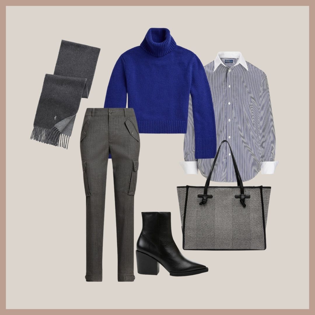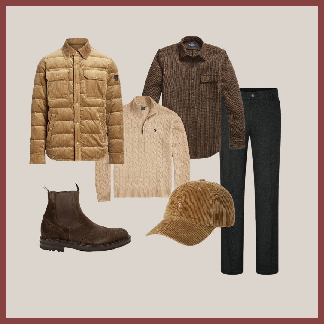 Doku ve tonların uyumunu bir araya getirdiğimiz, çoğunlukla Ralph Lauren'den seçtiğimiz parçalar ile bir kombin hazırladık. Bu sene kadife aksesuarları çokça göreceğiz