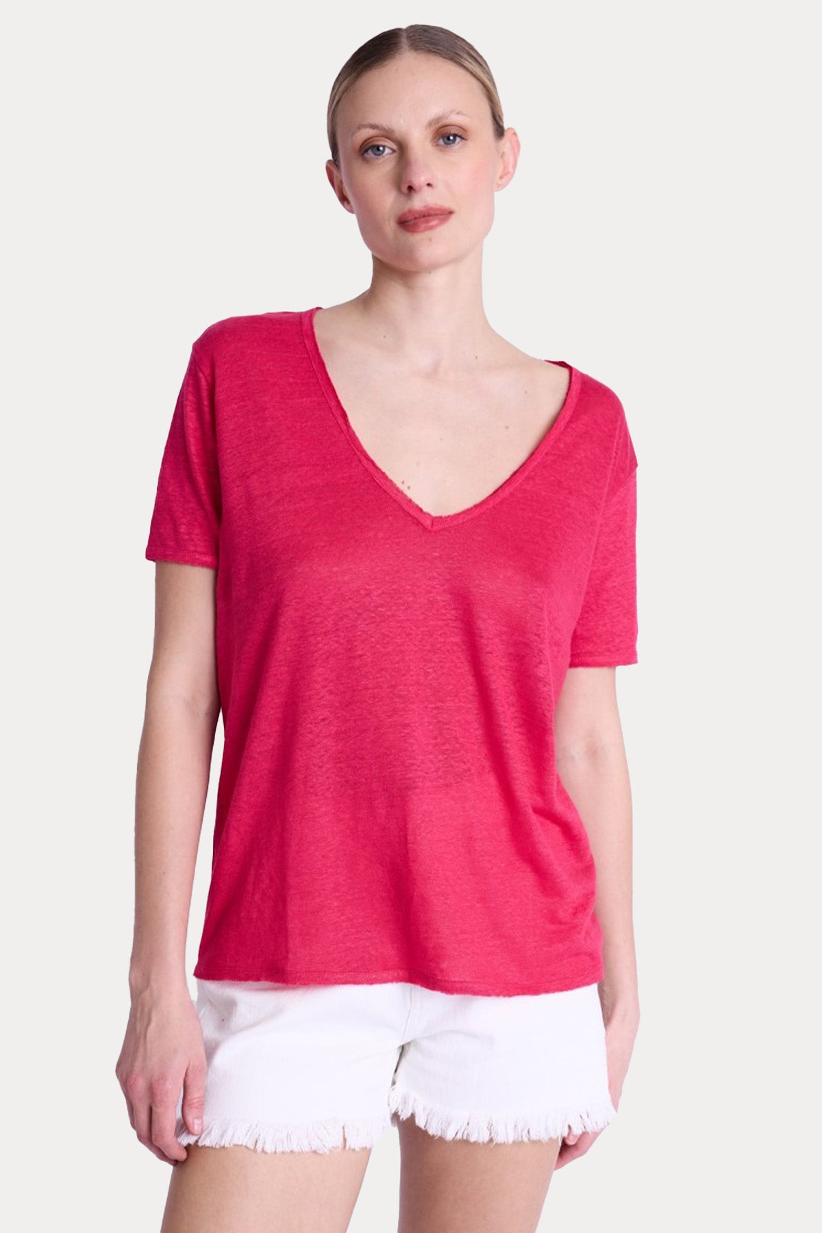 - Geniş V yaka, kısa kollu keten t-shirt.