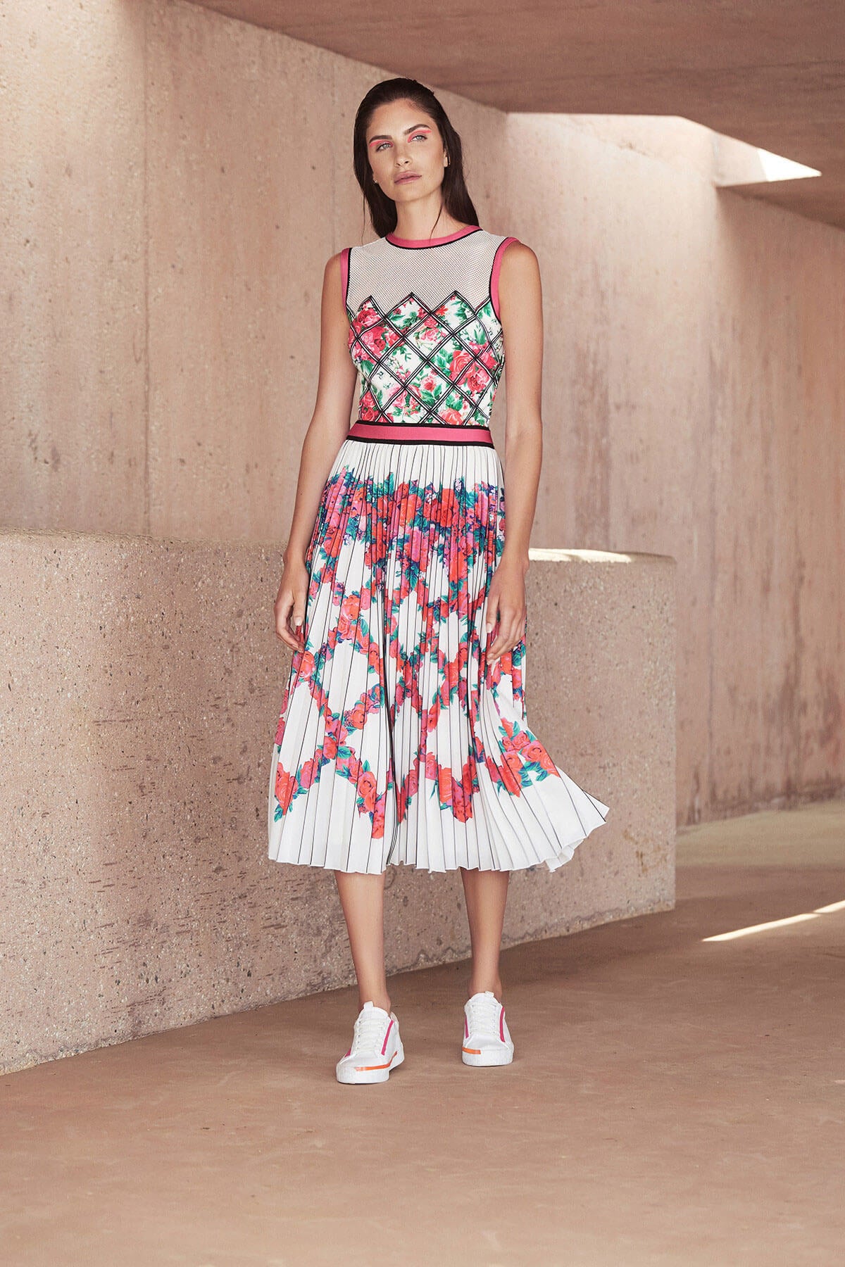 - Pileler ve zarif terzilik, cesur, sportif şeritler ve hem eğlenceli hem de sofistike bir elbise oluşturmak için dik boyunduruğu olan örme jakarlı bir korse ile dengelenmiştir.