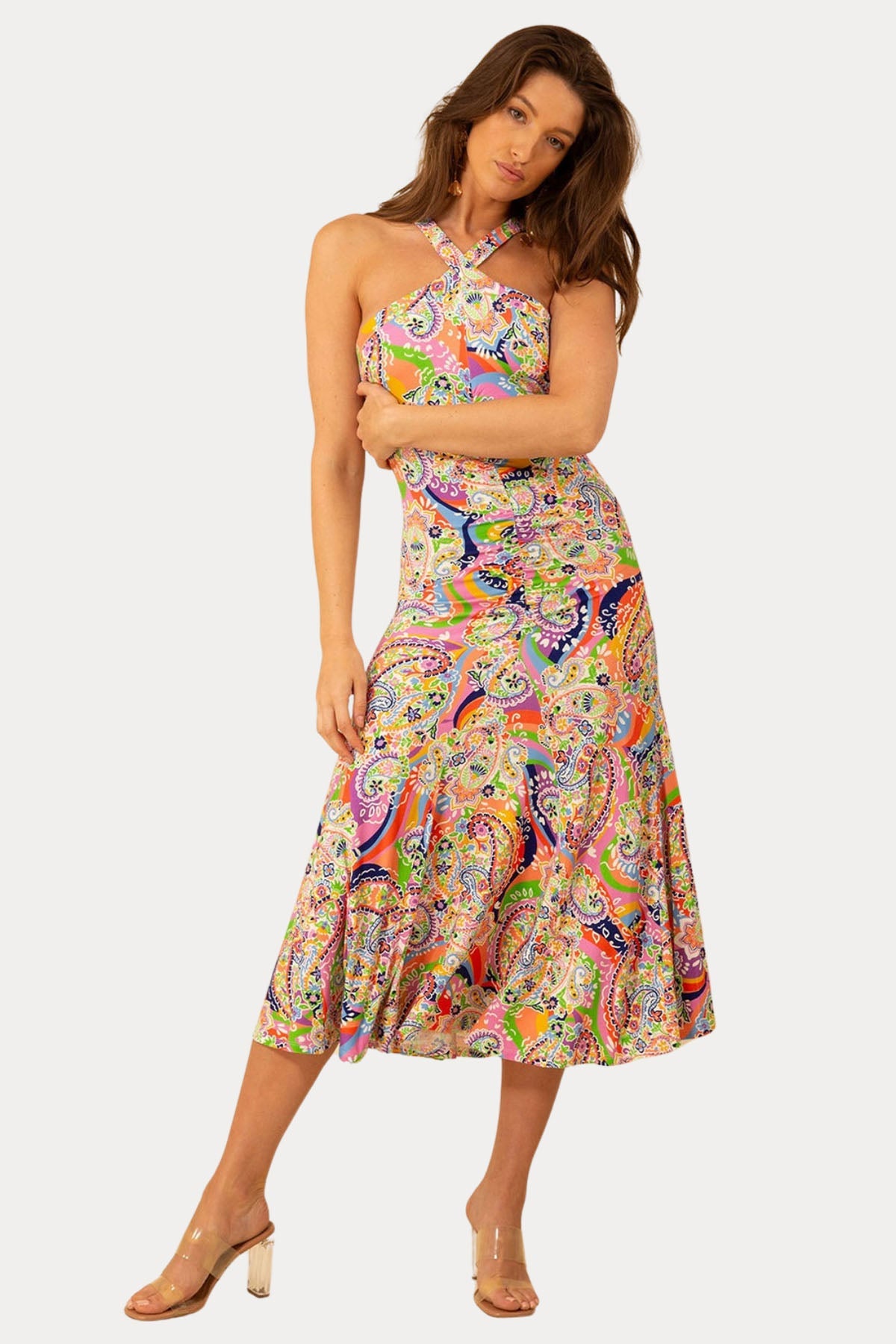 Hale Bob Boyundan Çapraz Bantlı Etnik Desenli Midi Elbise