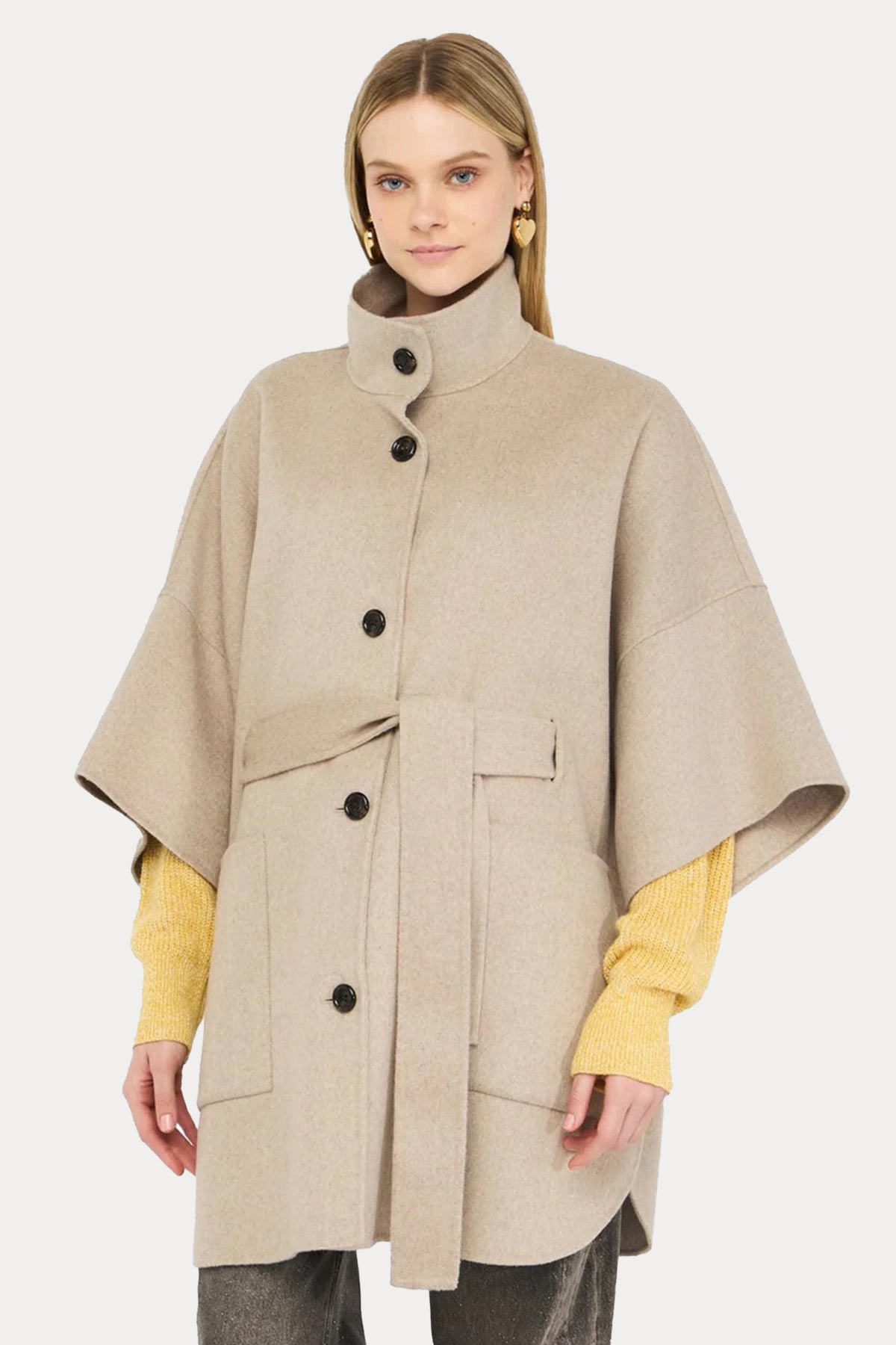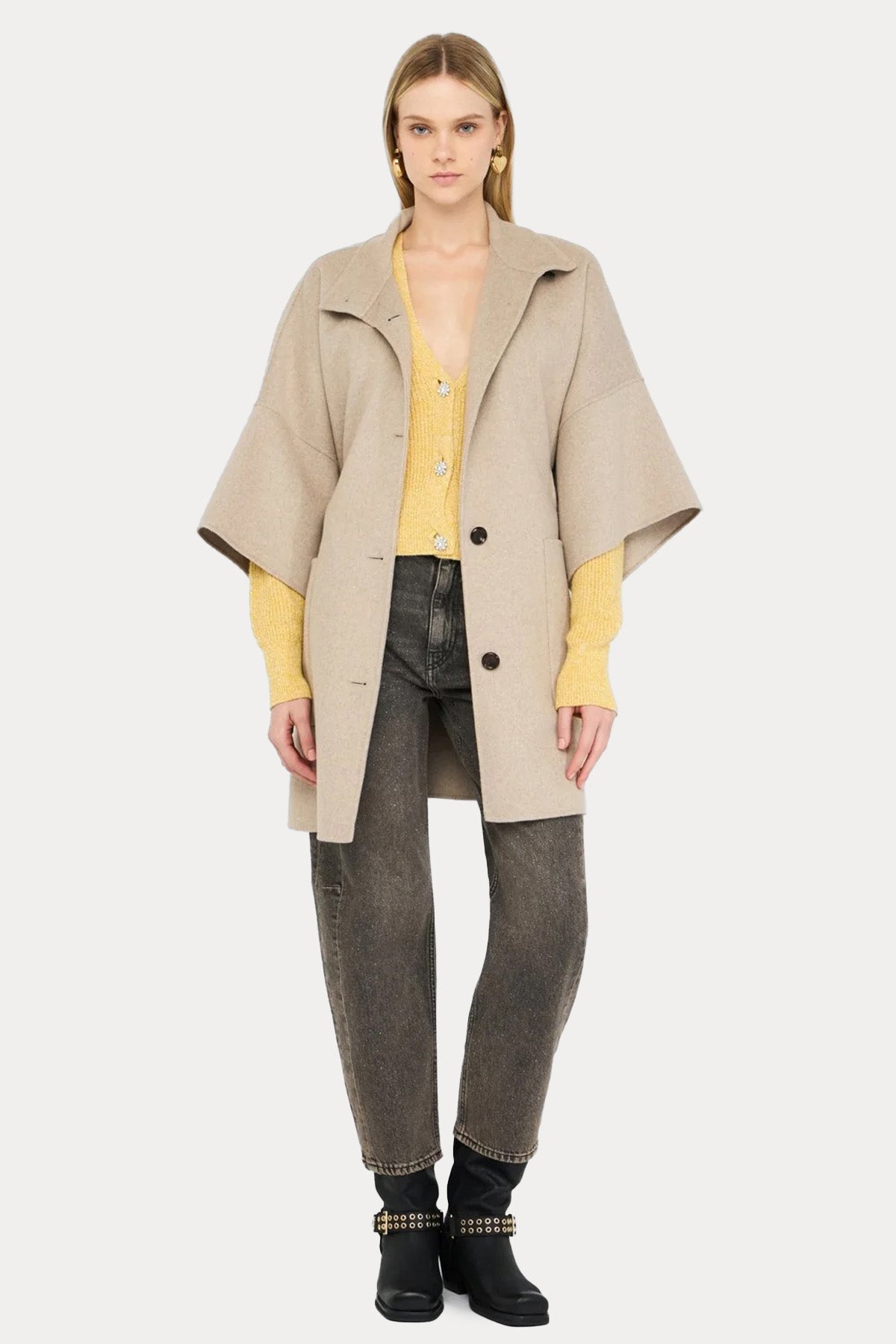 Berenice Comfort Fit Dik Yaka Deri Detaylı Yün Kaban