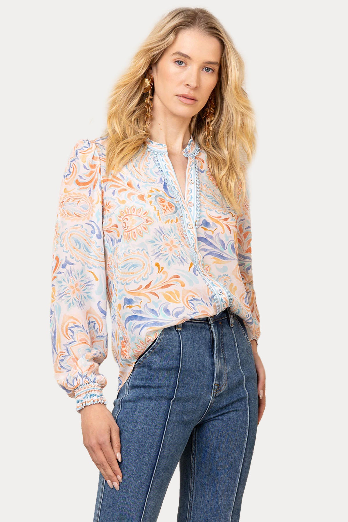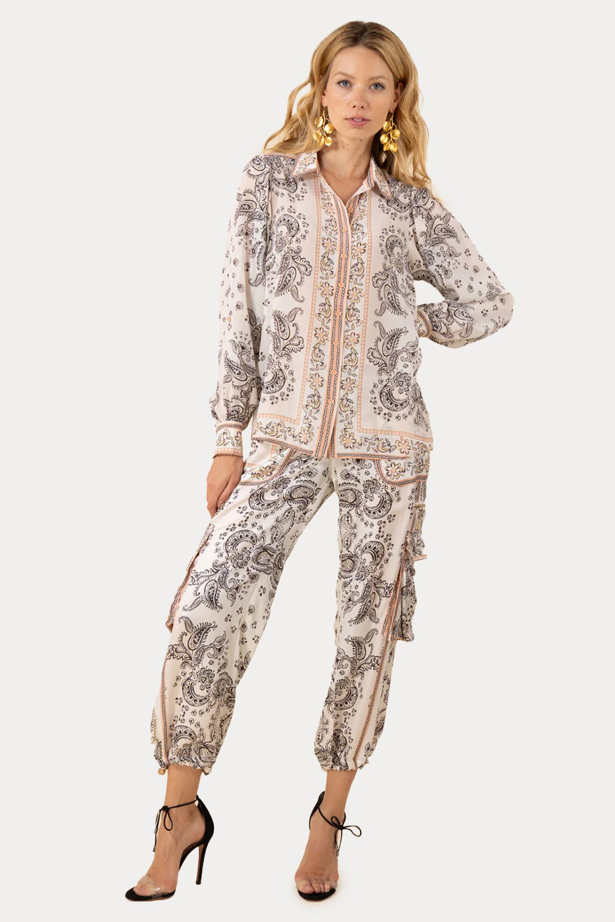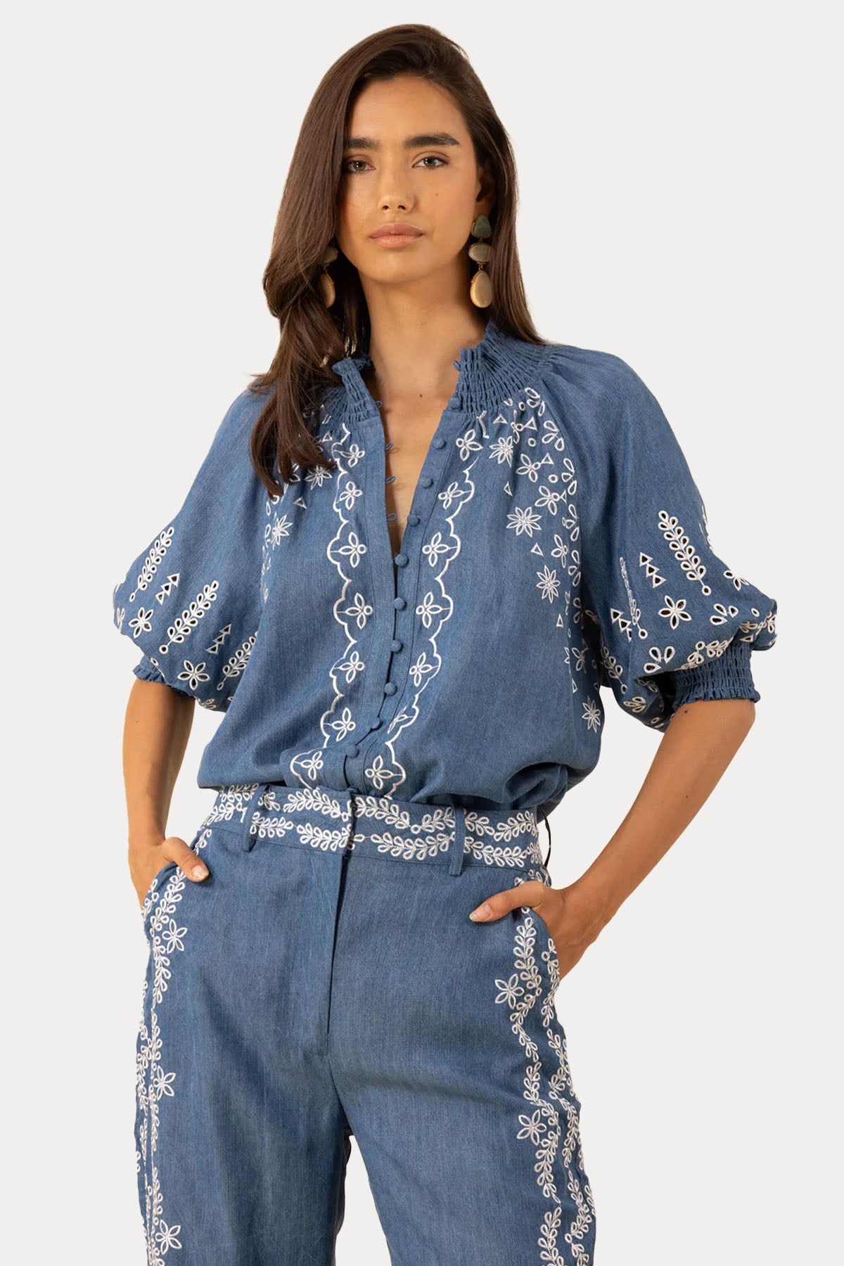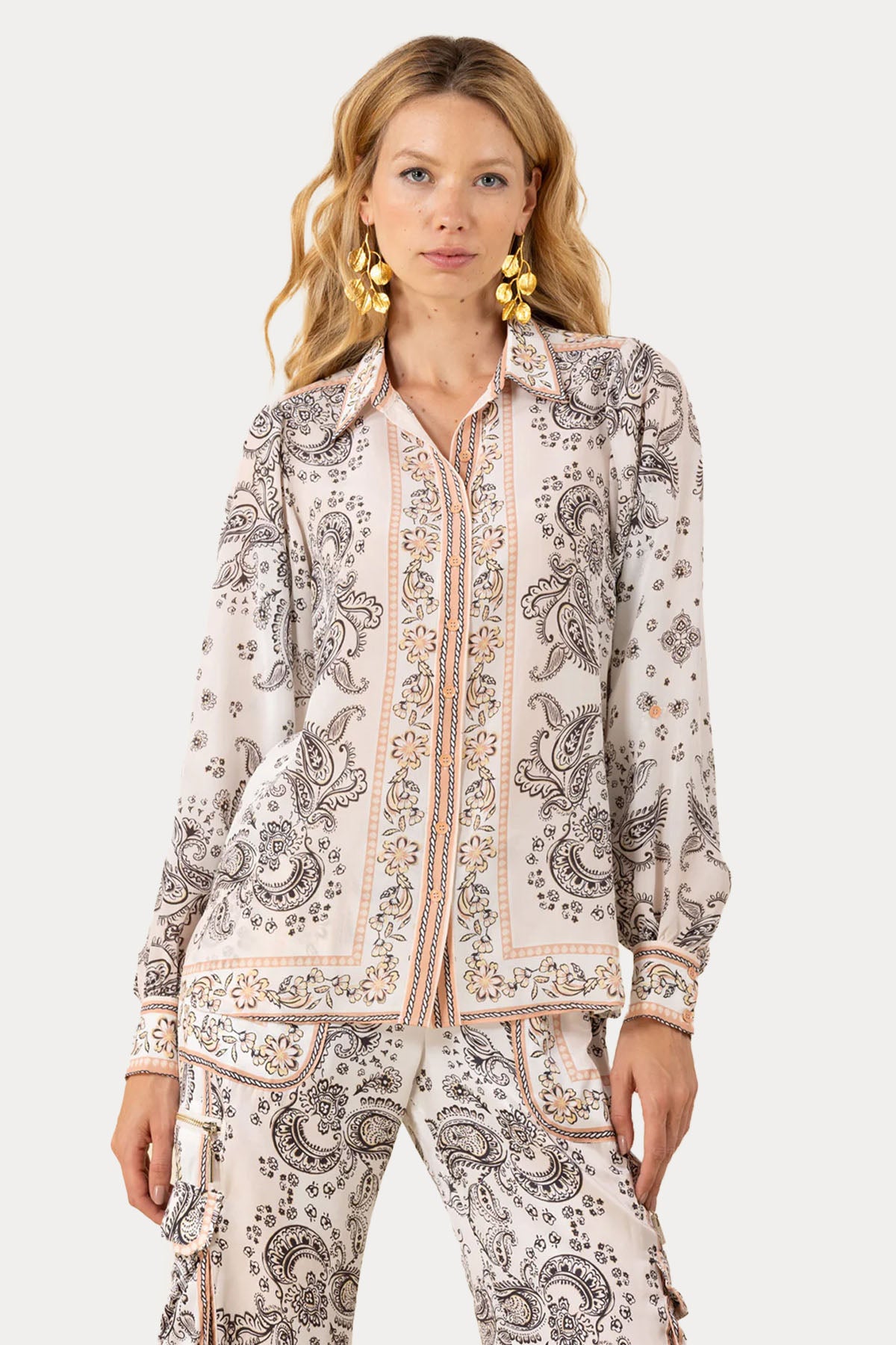 Hale Bob Relaxed Fit Streç Dik Yaka Nakışlı Gömlek