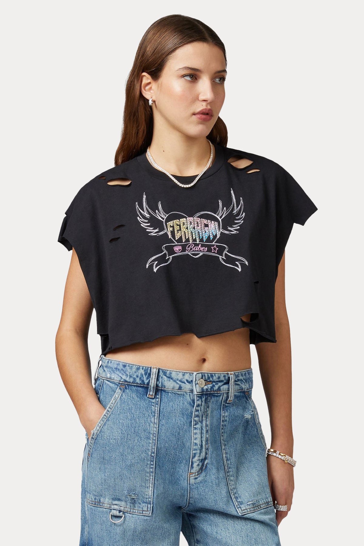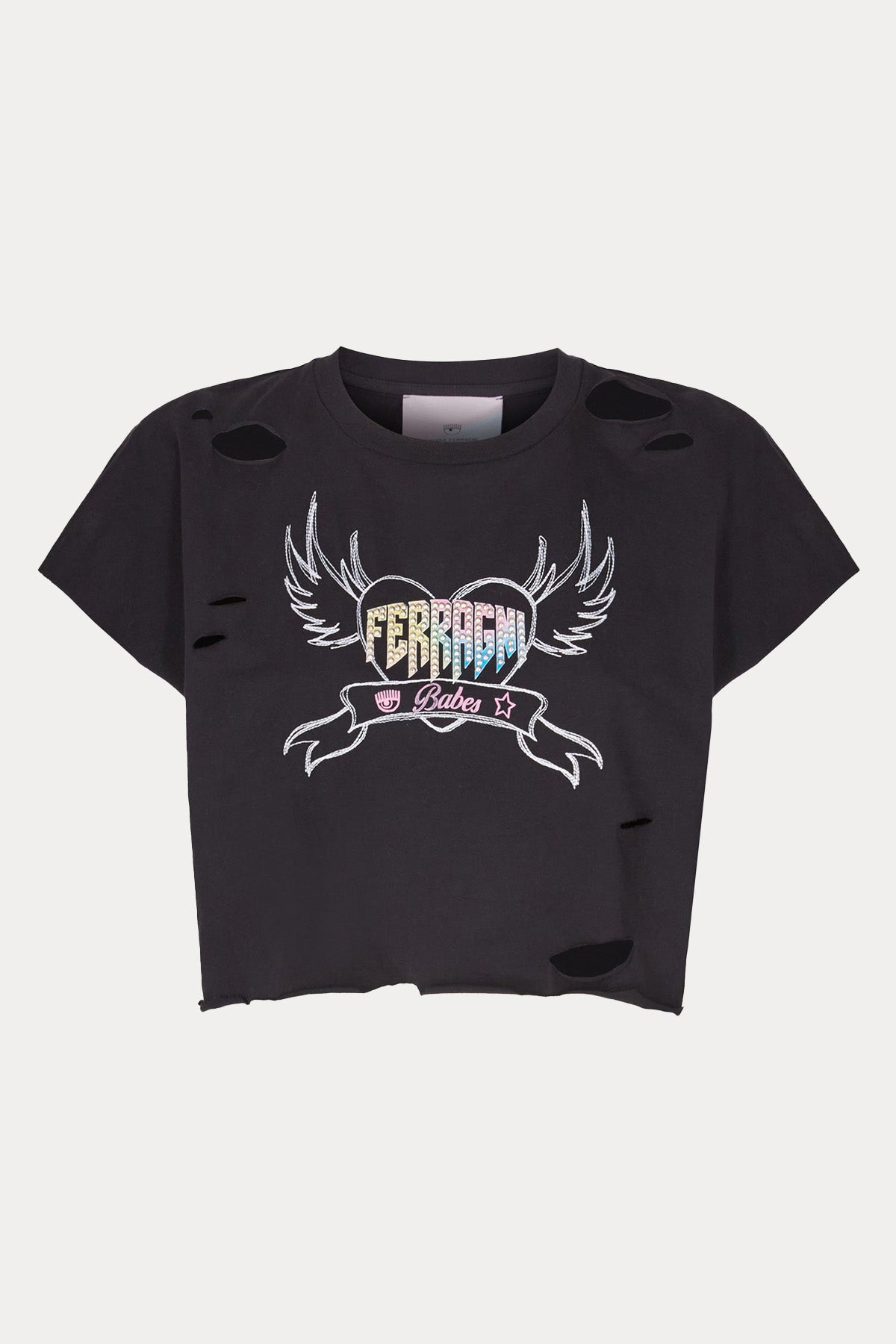 Chiara Ferragni Yuvarlak Yaka Yırtıklı Tasarım Logolu Crop T-shirt