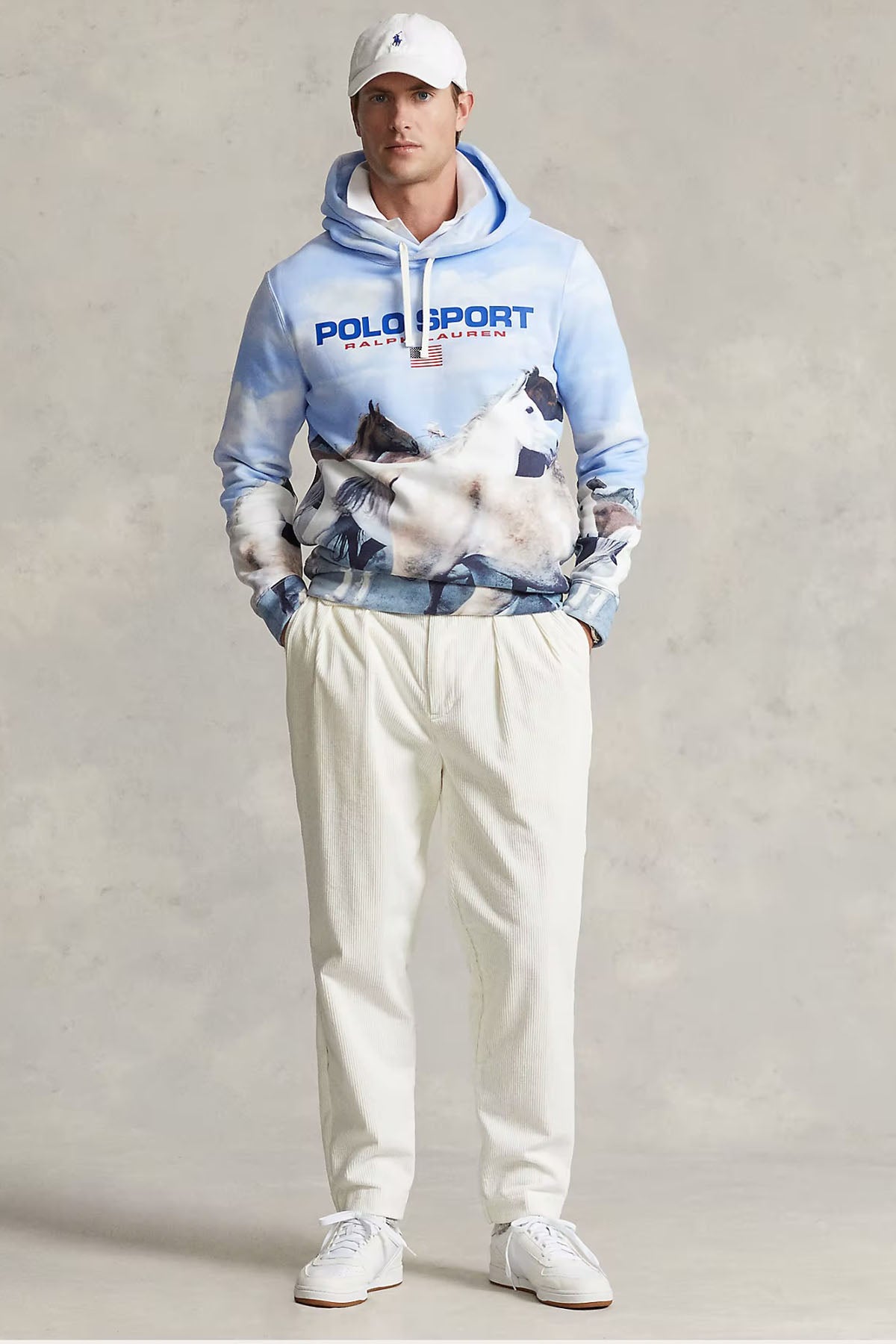 - Bu kapüşonlu sweatshirte, Bay Kurt Markus tarafından fotoğraflanan ikonik bir Ralph Lauren kampanya resmi olan "Vahşi Atlar"ın baskısı bulunuyor.