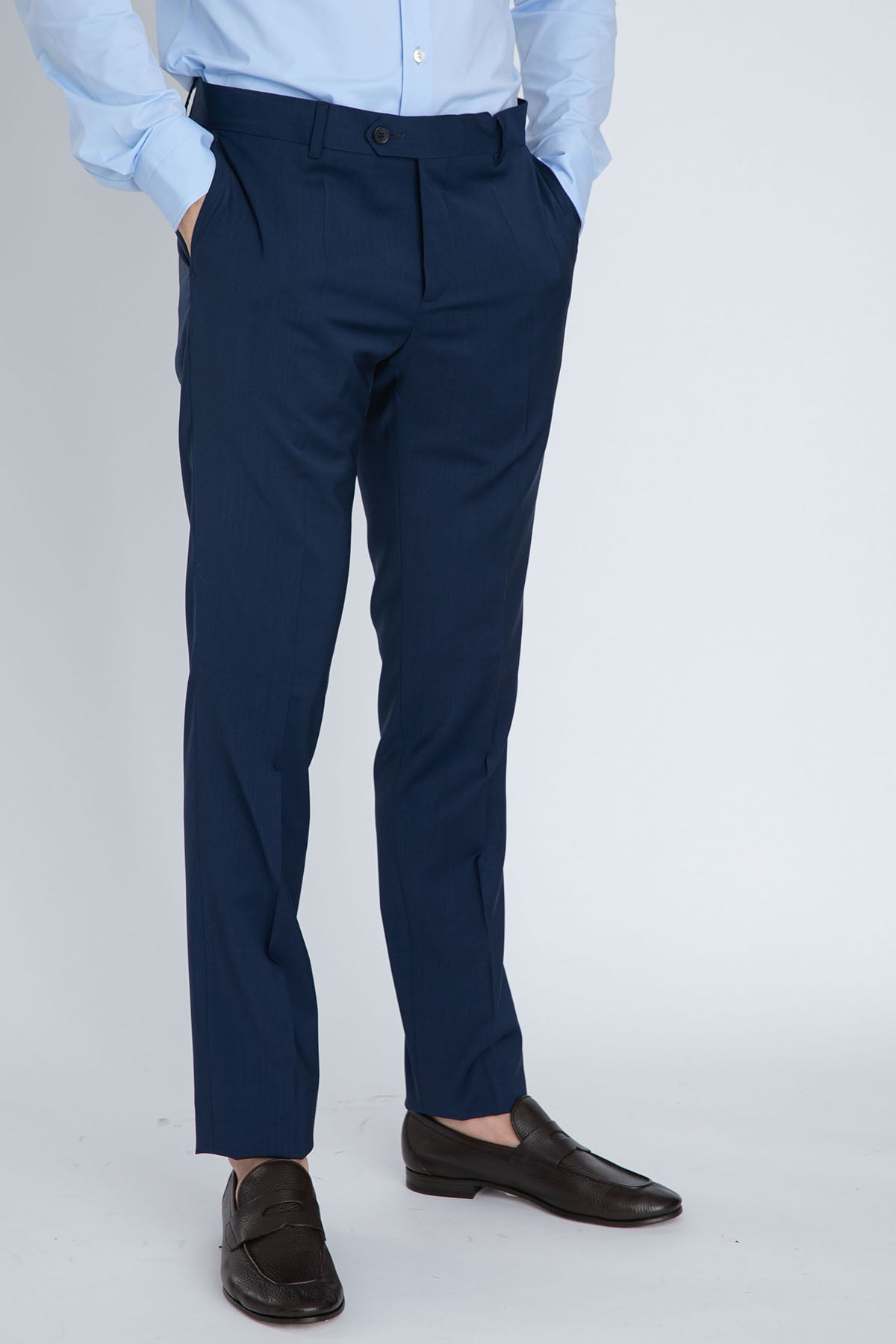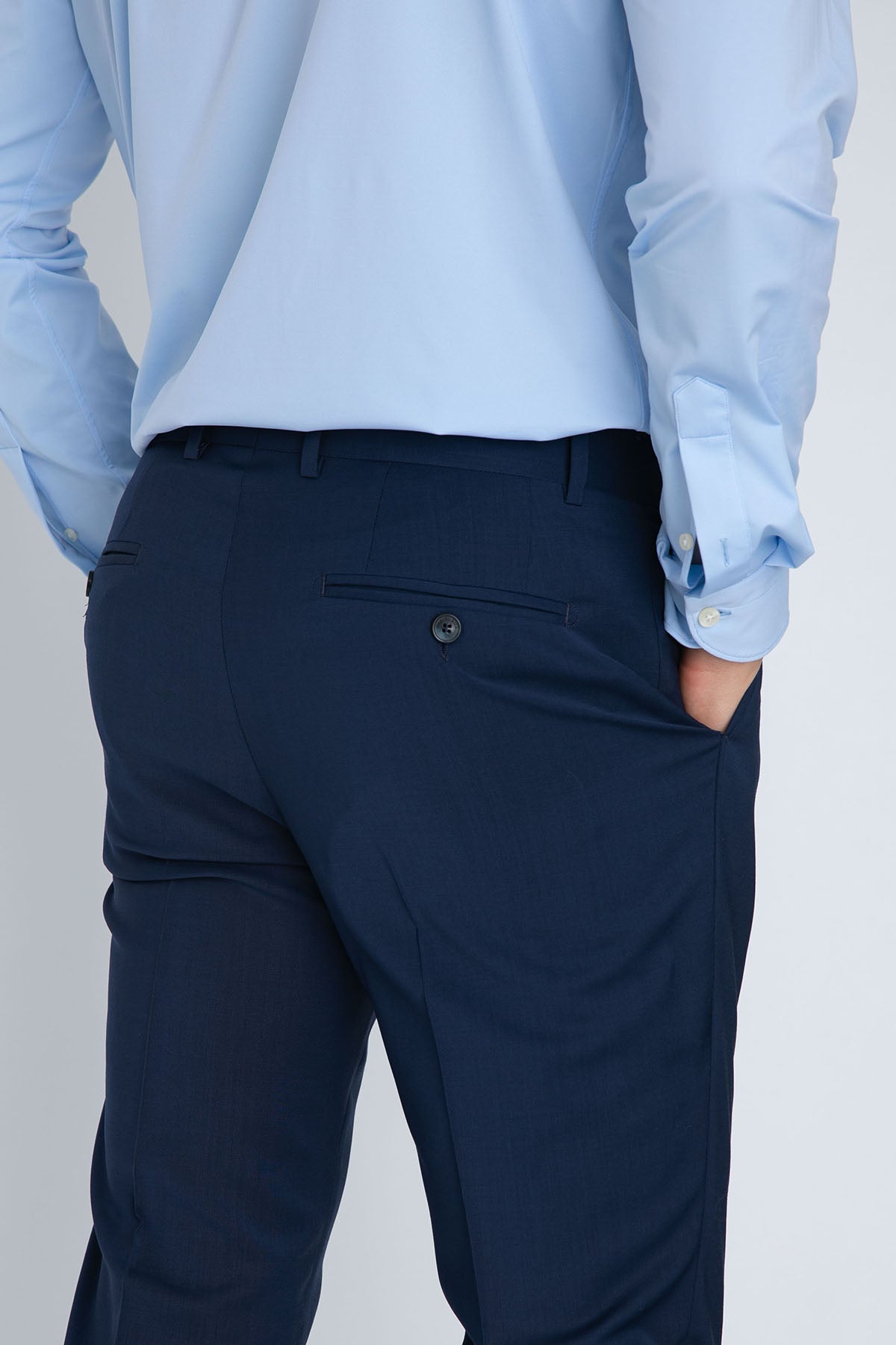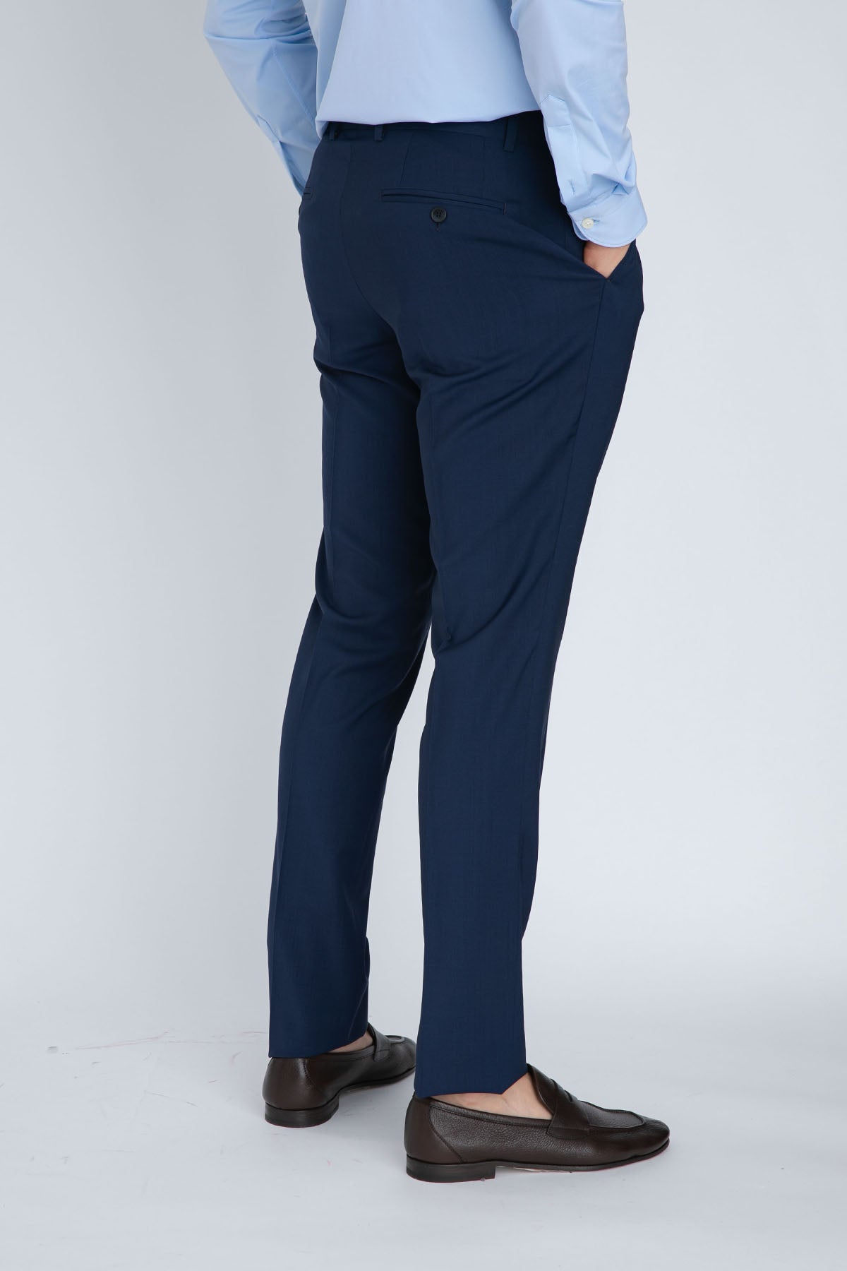 Çift düğme, metal kanca ve fermuar kapatmalı bel kısmı.