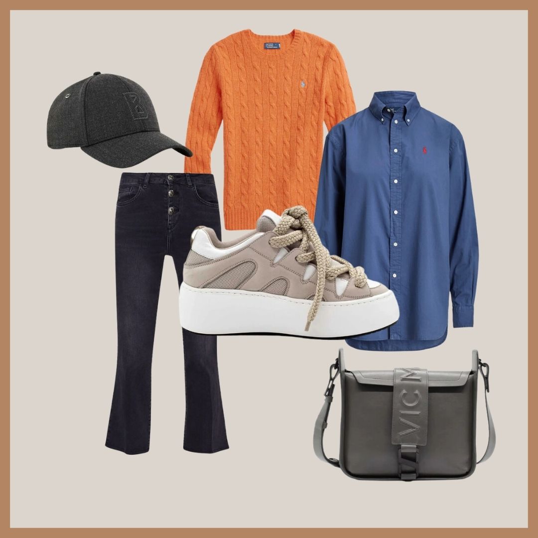 Haftasonunu planlarınız için çabasız ama zevkli bir görünüm düşündük. Enerjinizi yükseltecek renkte Ralph Laurenden turuncu bir triko tercih ettik ve bunu günün temposuna uygun Vic Matie sneaker ile eşleştirdik.