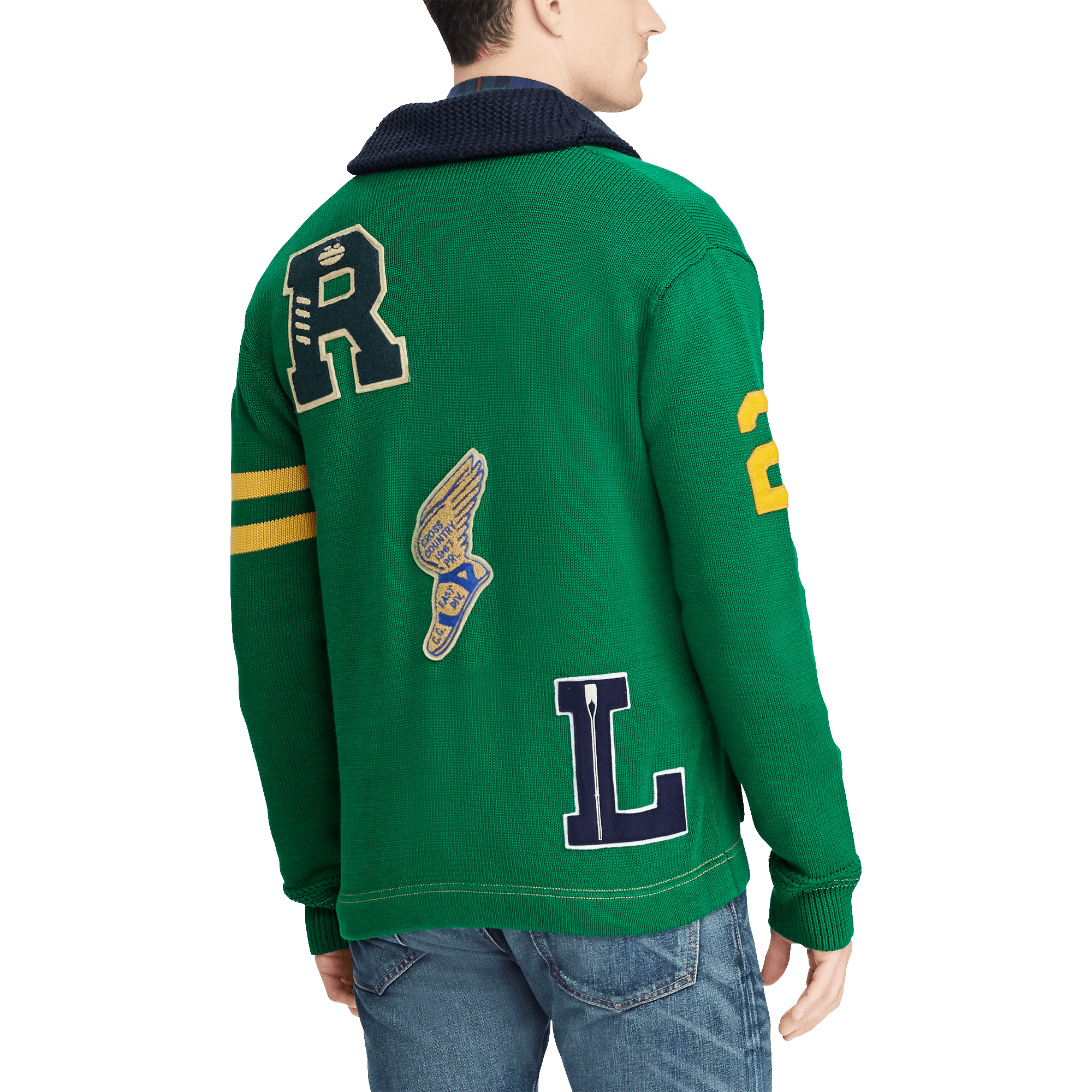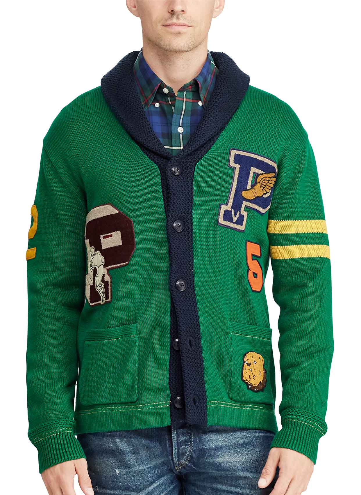 - Şal yaka, armalı kolej triko ceket