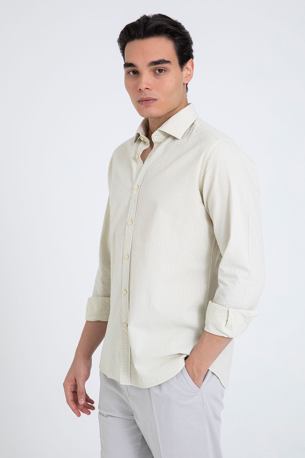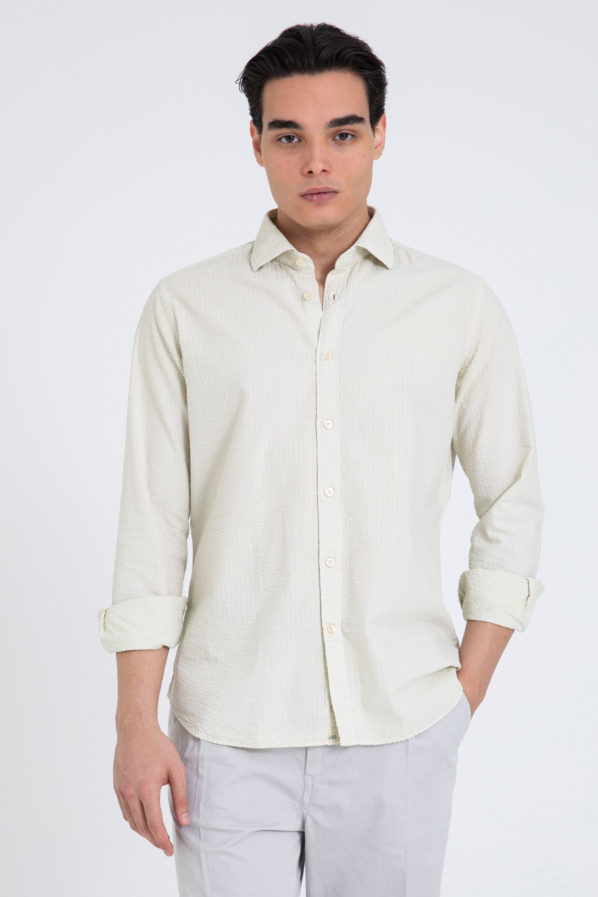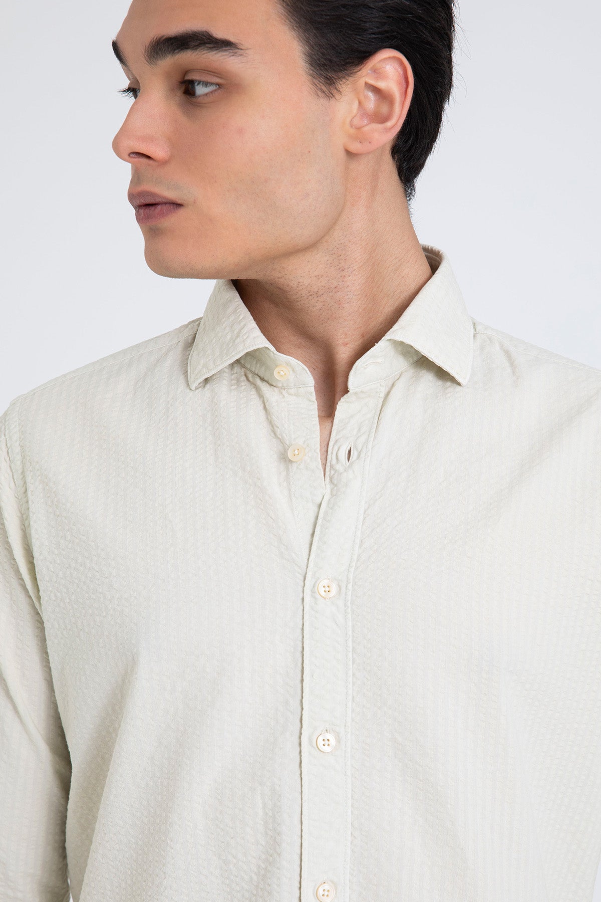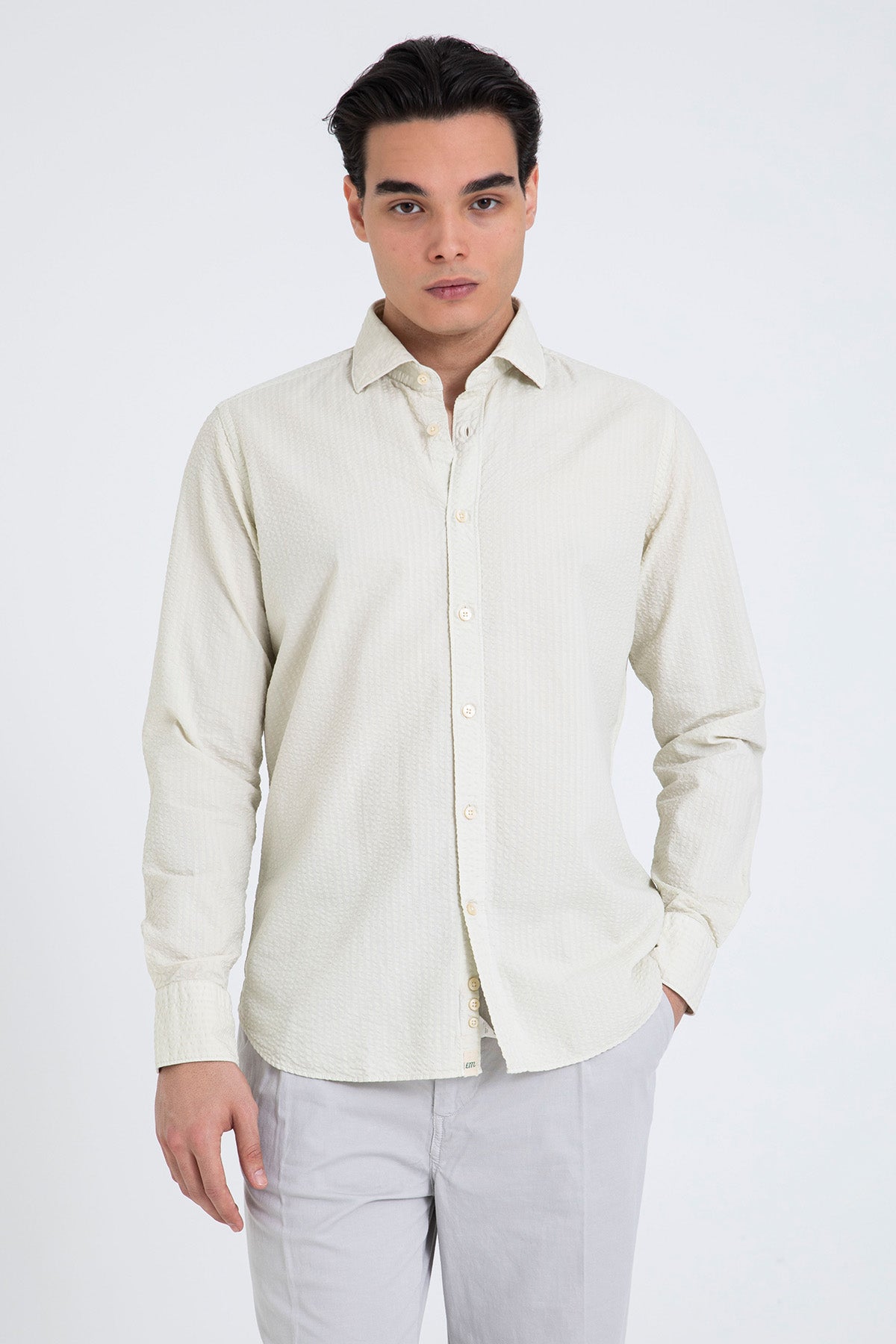 - Yumuşak dokulu pamuk karışımlı kumaştan üretilmiş, klasik yakalı, sade ve zarif bir ekru gömlek. Minimal düğme detaylarıyla tamamlanmıştır. Hafta sonu kombinlerinde keten pantolonlarla şık bir uyum sağlar. İşlevsel yapısı sayesinde ofisten tatil akşamlarına geçişlerde de tercih edilebilir.
