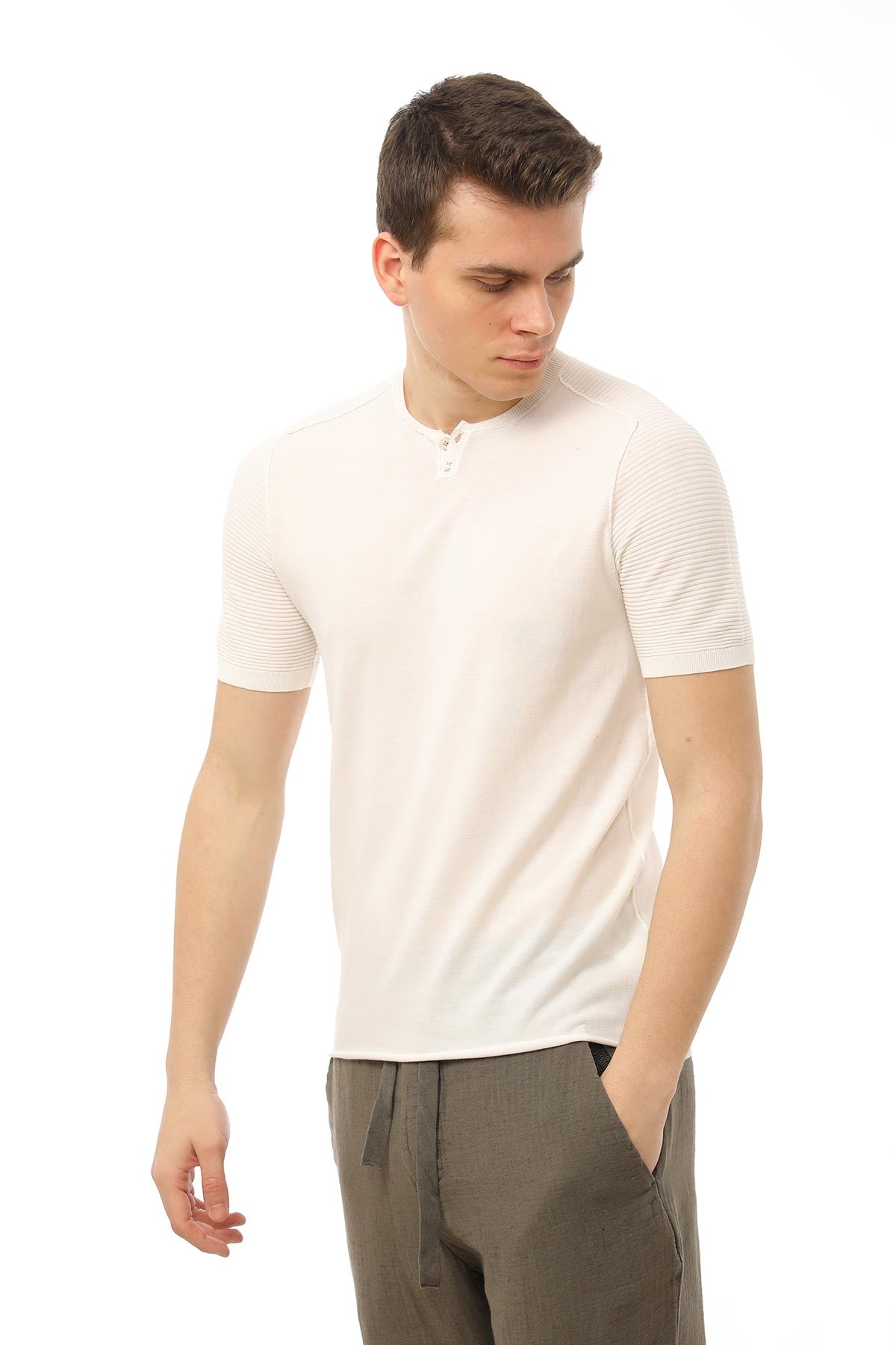 - Yuvarlak yaka, kısa kollu örme detaylı t-shirt.