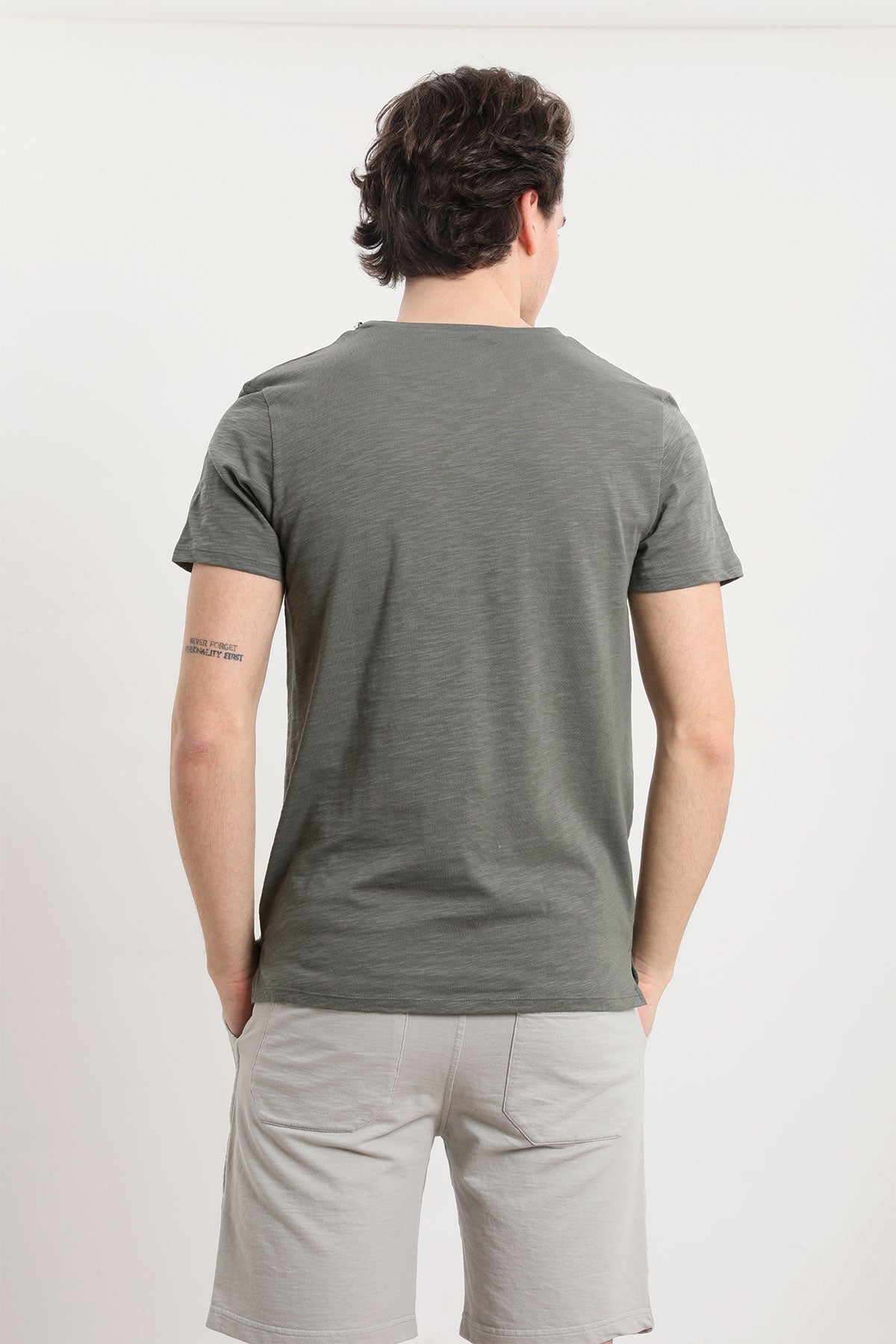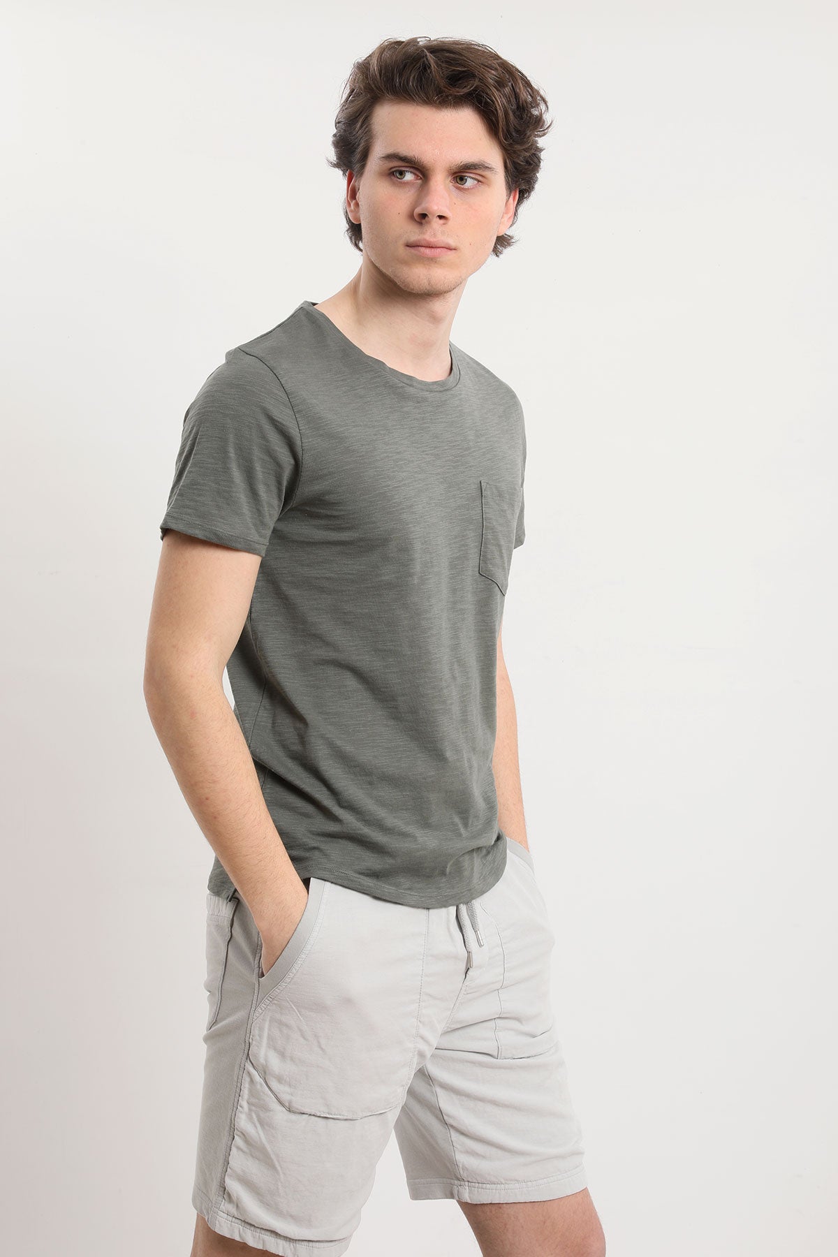- Yuvarlak yaka, kısa kollu pamuklu t-shirt.
