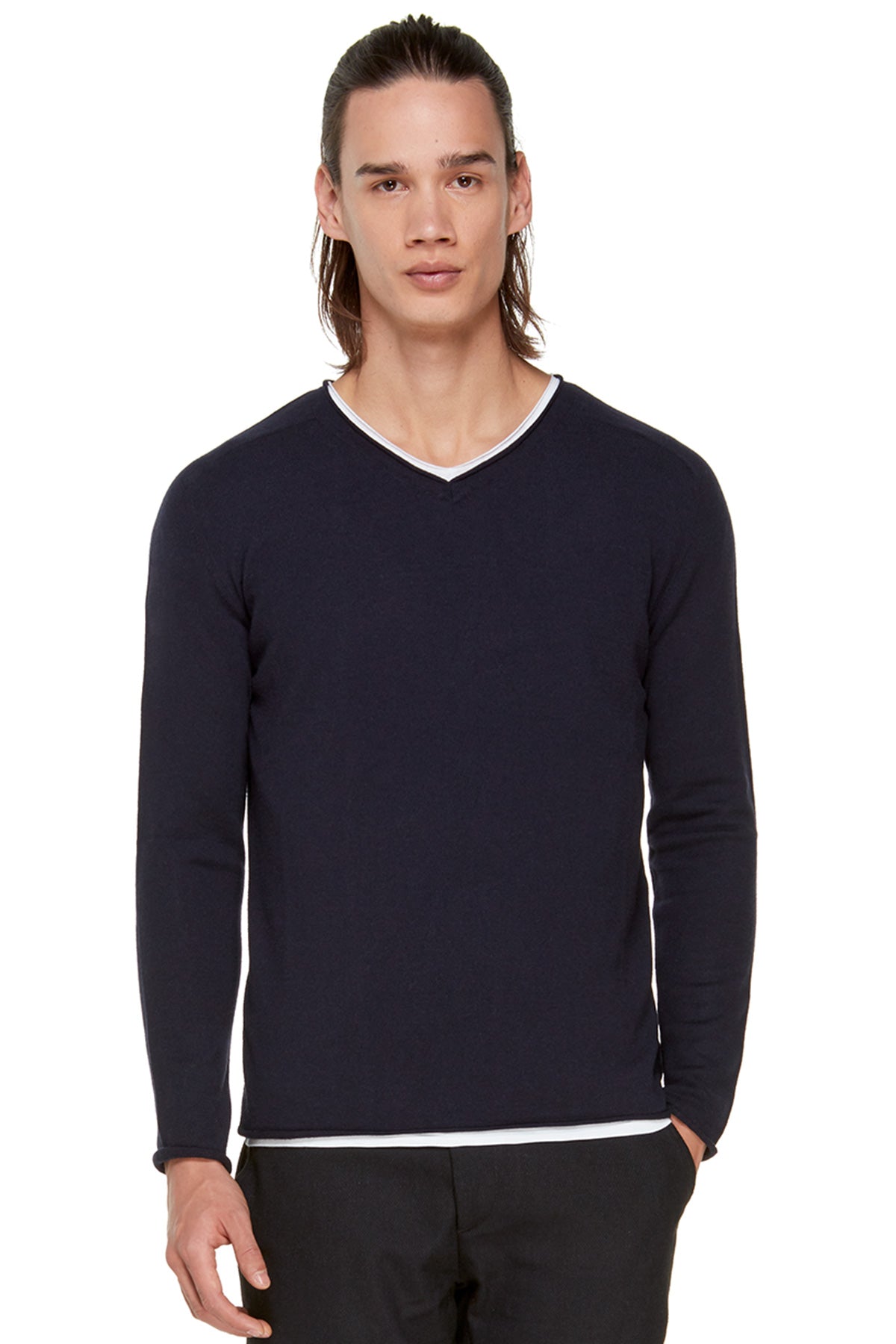 - V yaka uzun kollu kaşmir karışımlı yün triko.