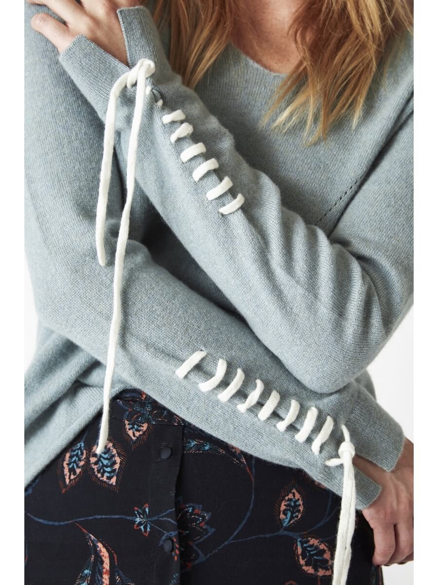 - Kollarda beyaz ip detayları