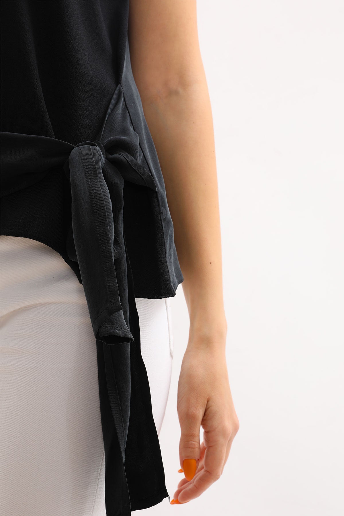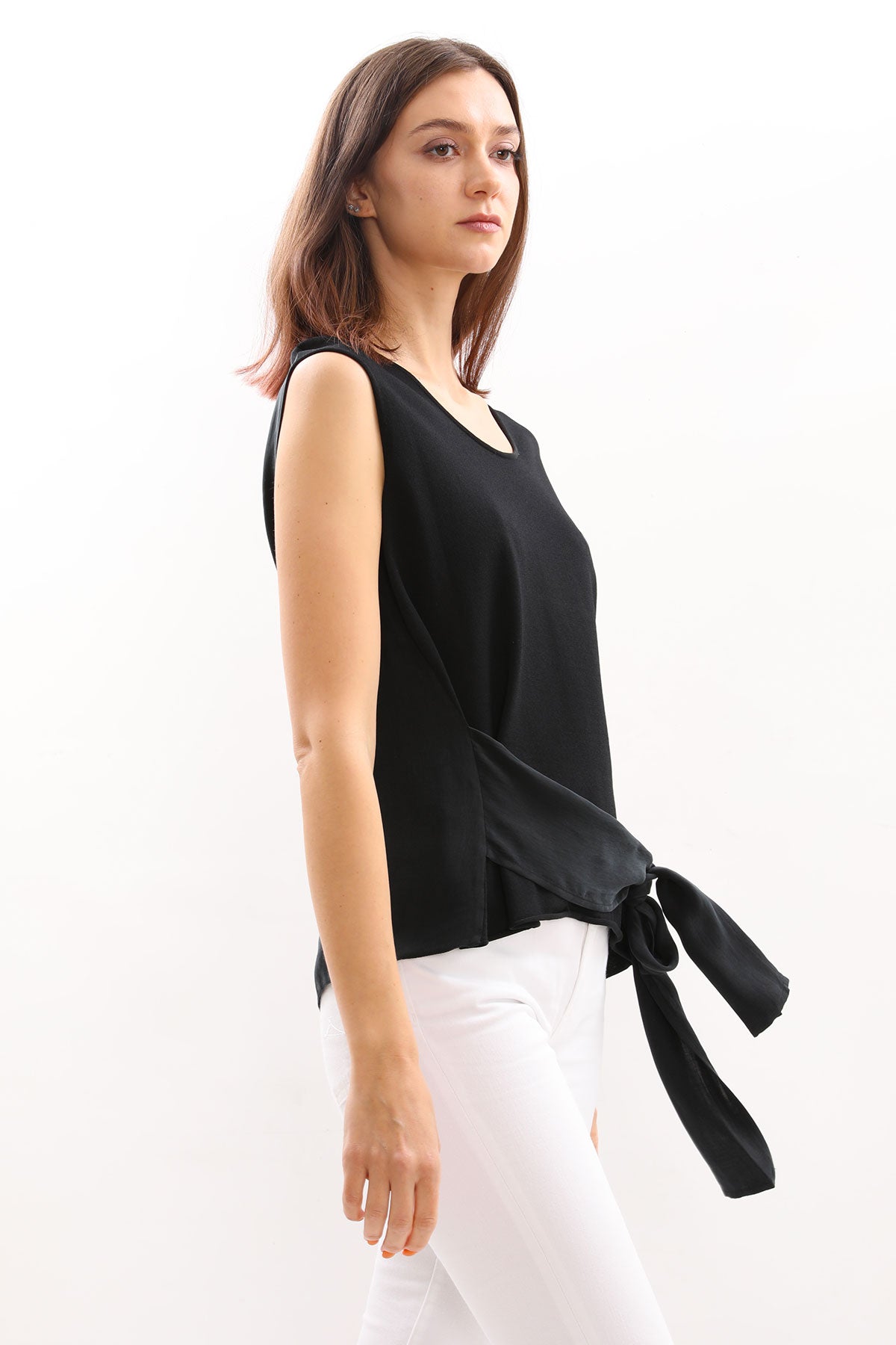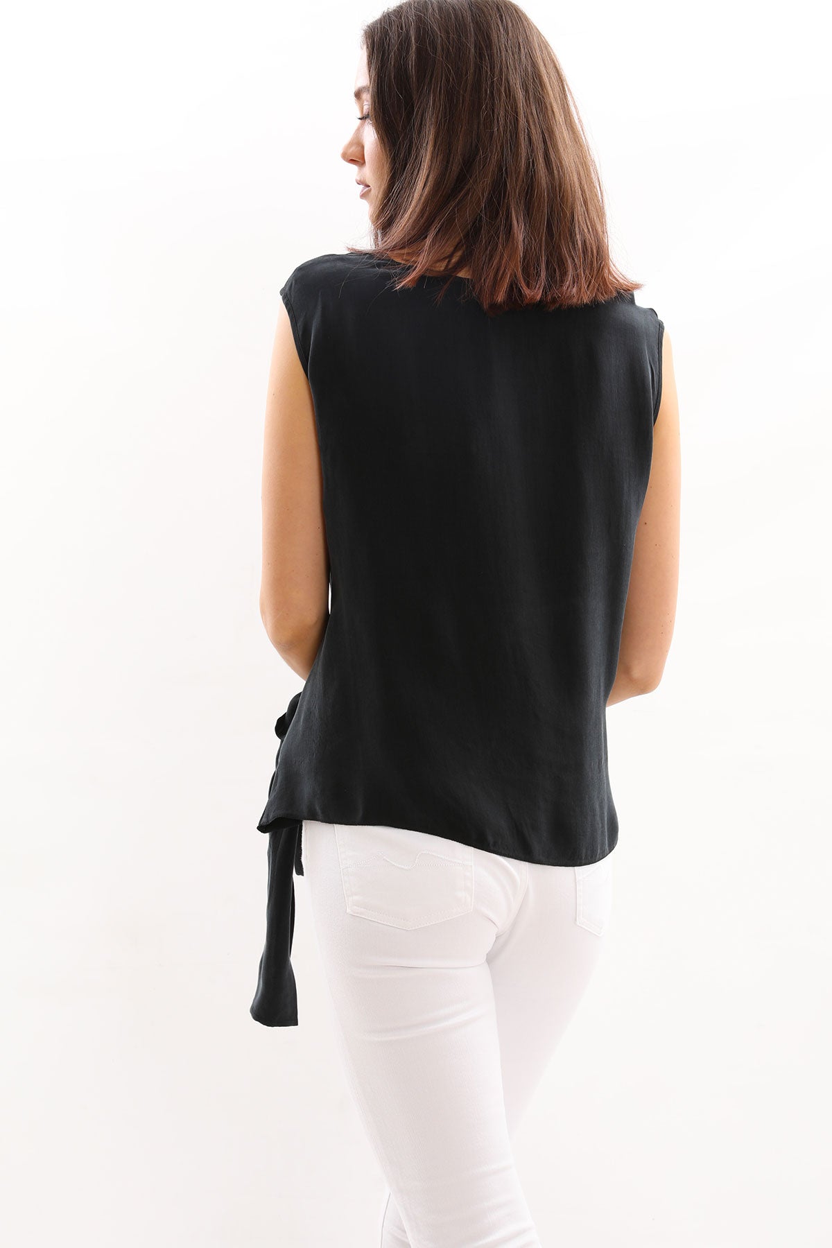 - Yuvarlak yaka, kalın askılı kolsuz ipek bluz.
