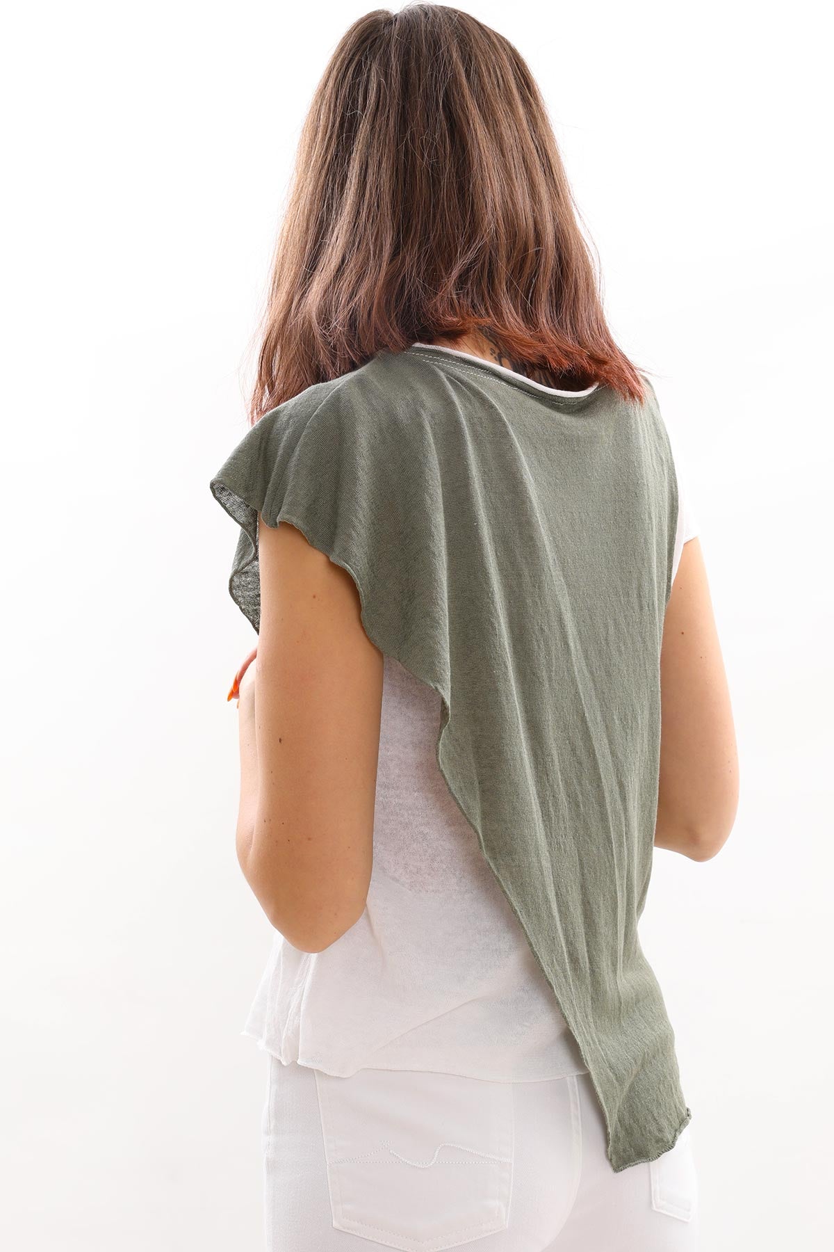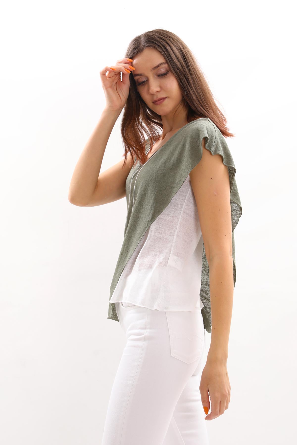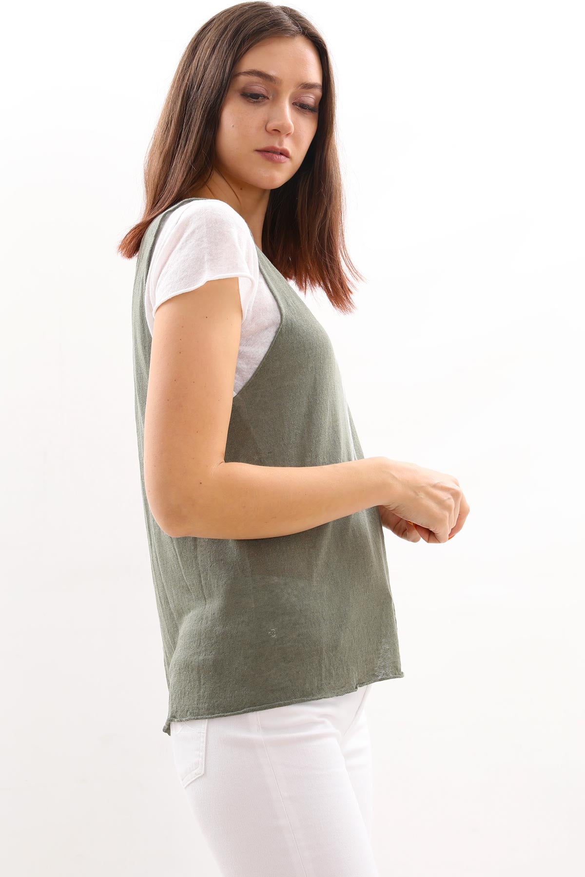 - Yuvarlak yaka, kalın askılı kısa kollu keten bluz.