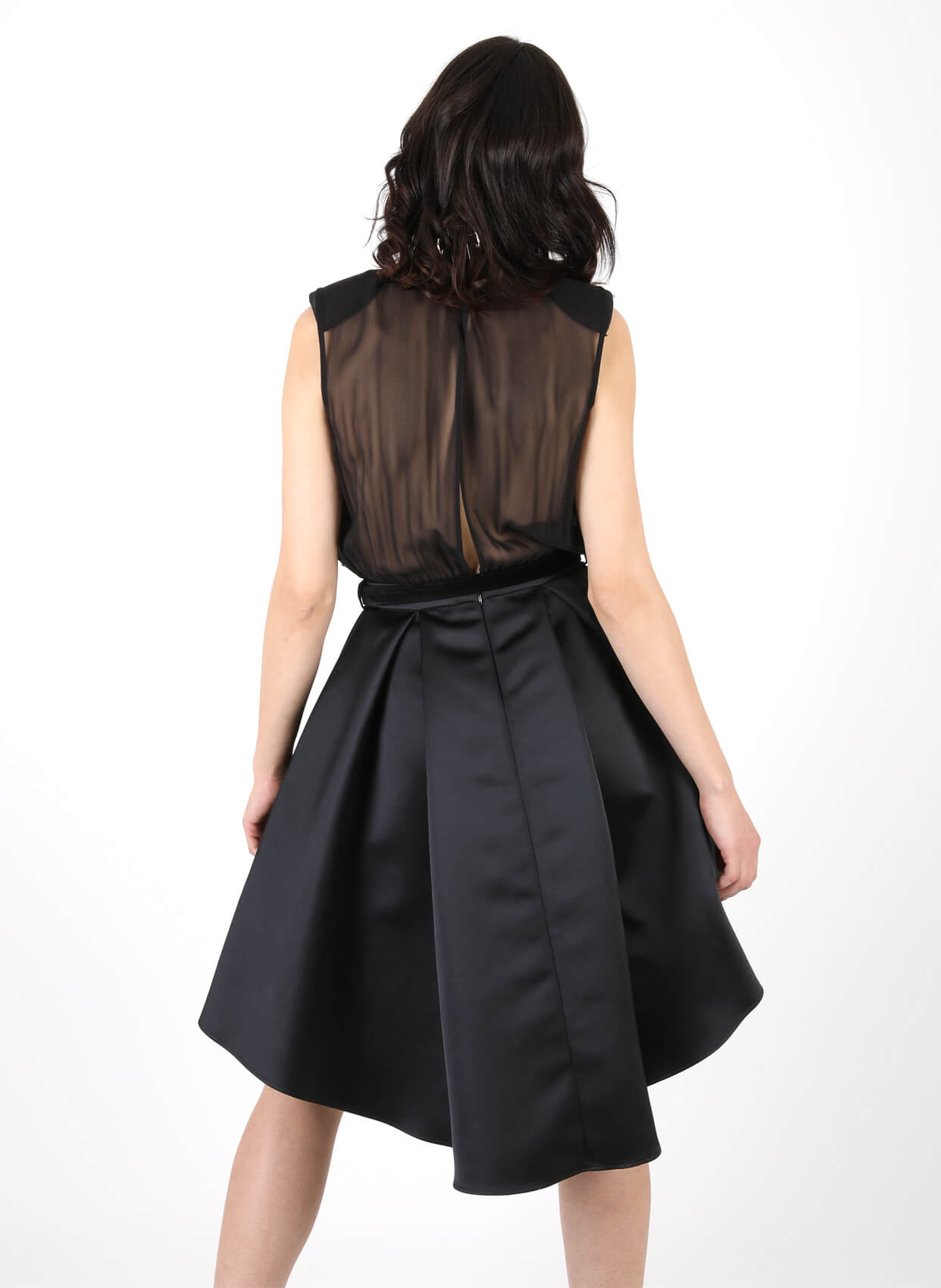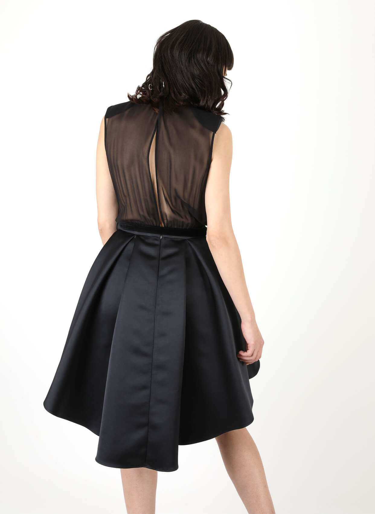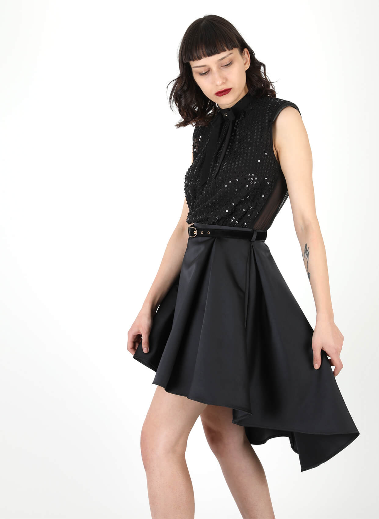 - Yuvarlak yaka asimetrik kesimli parti elbise