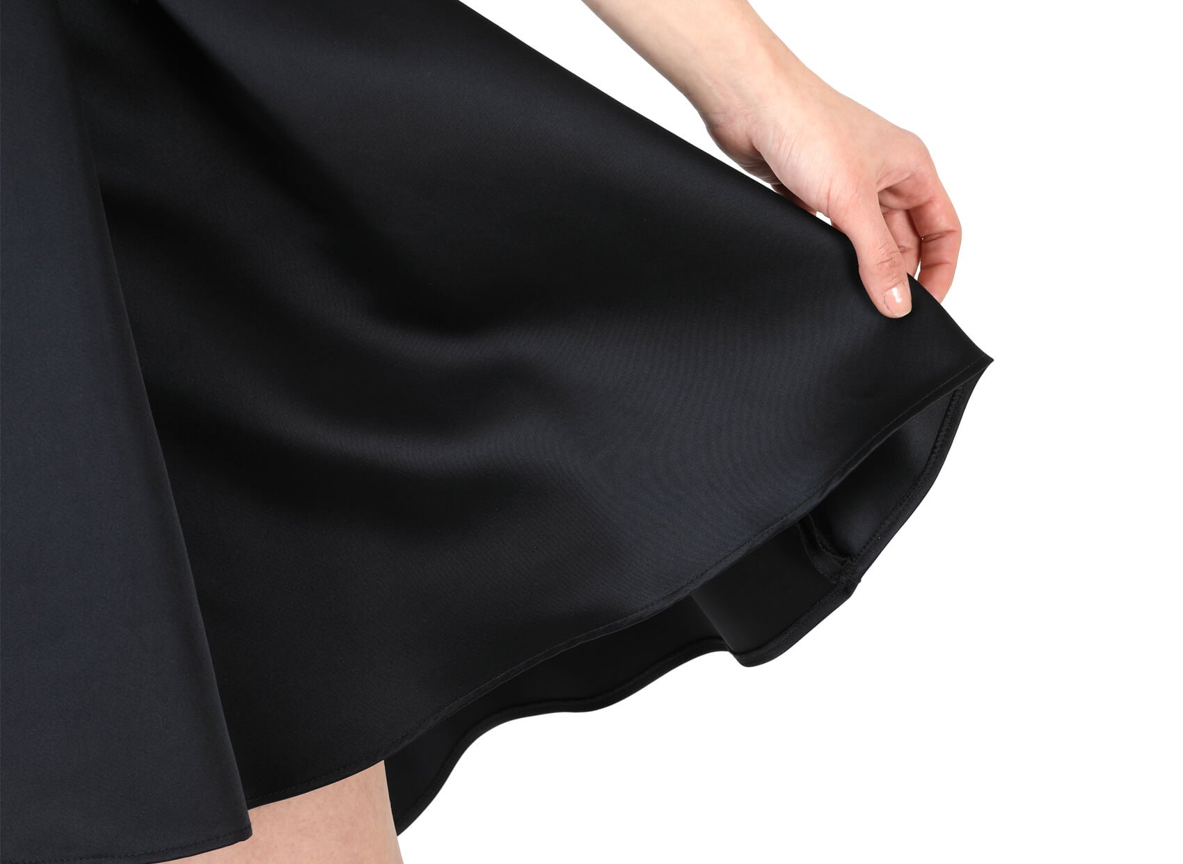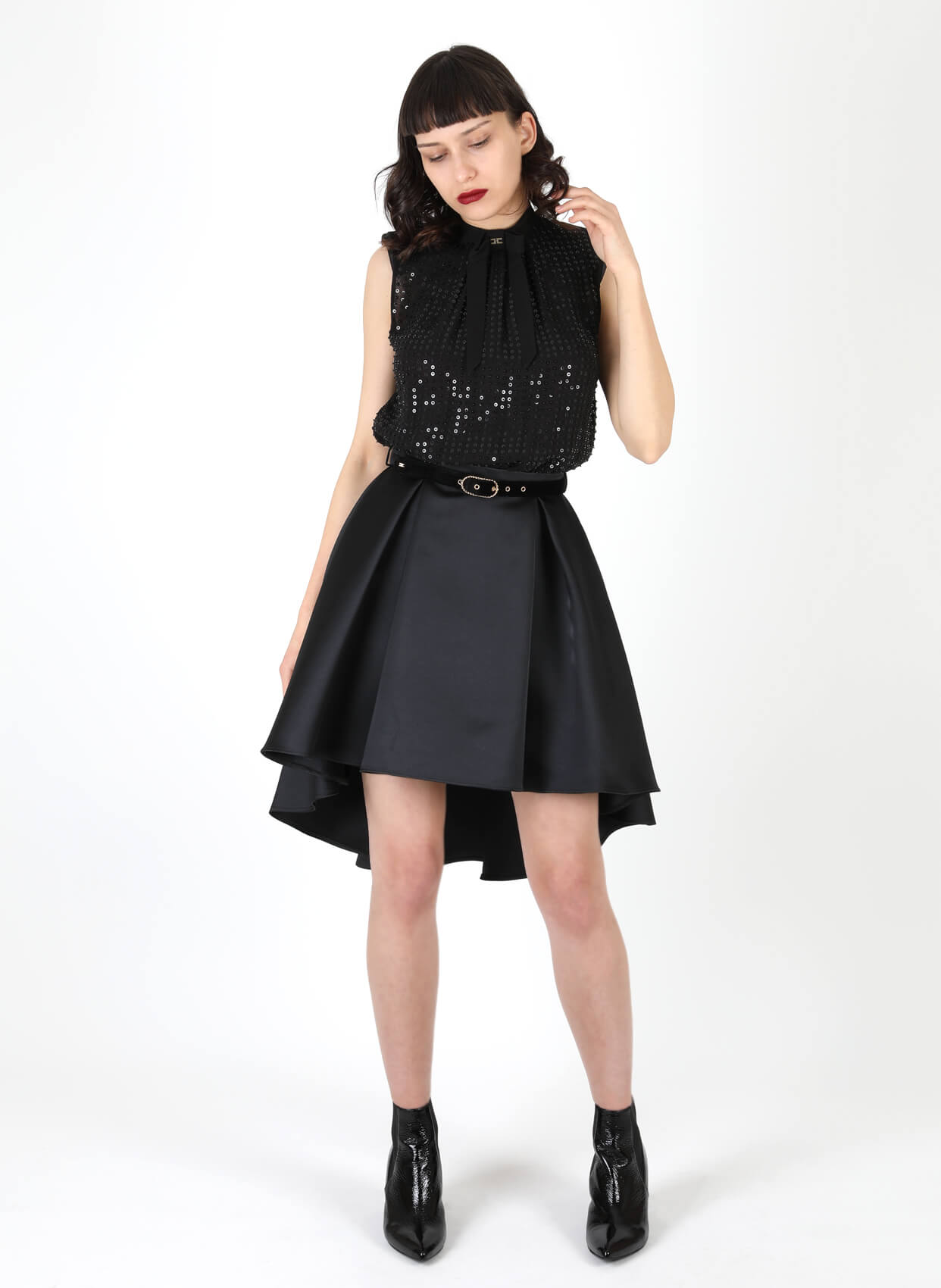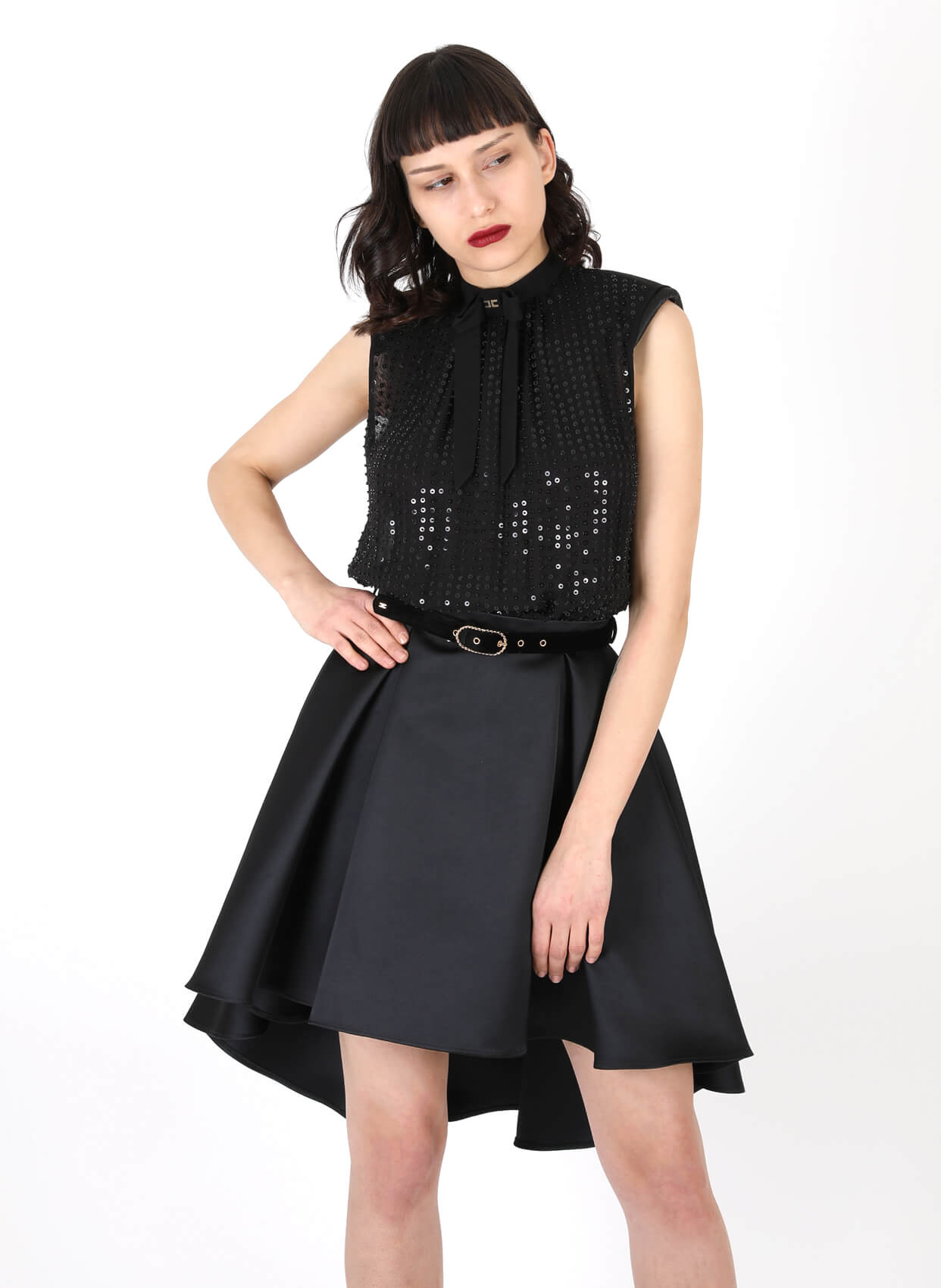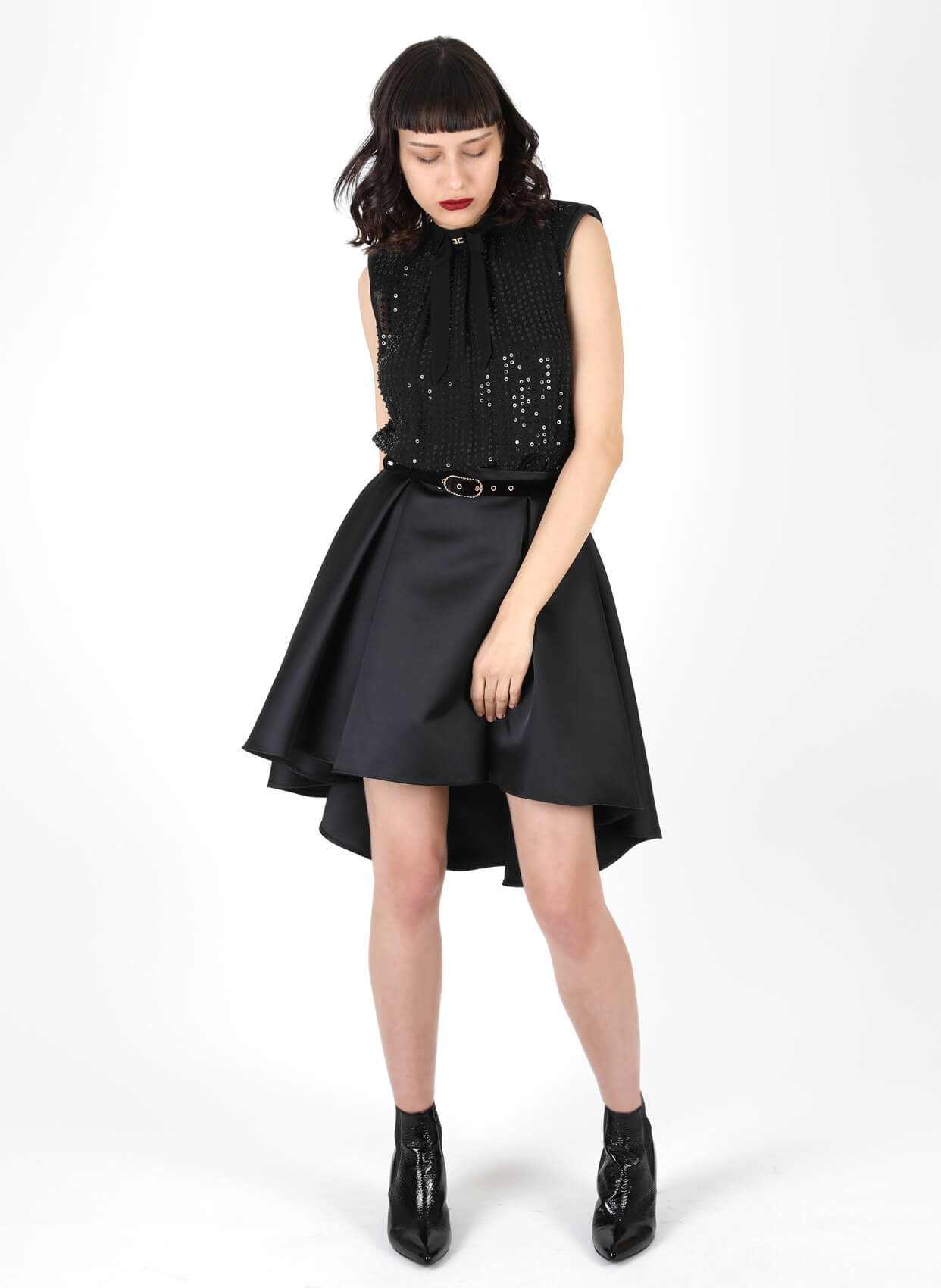 - Yuvarlak yaka asimetrik kesimli parti elbise
