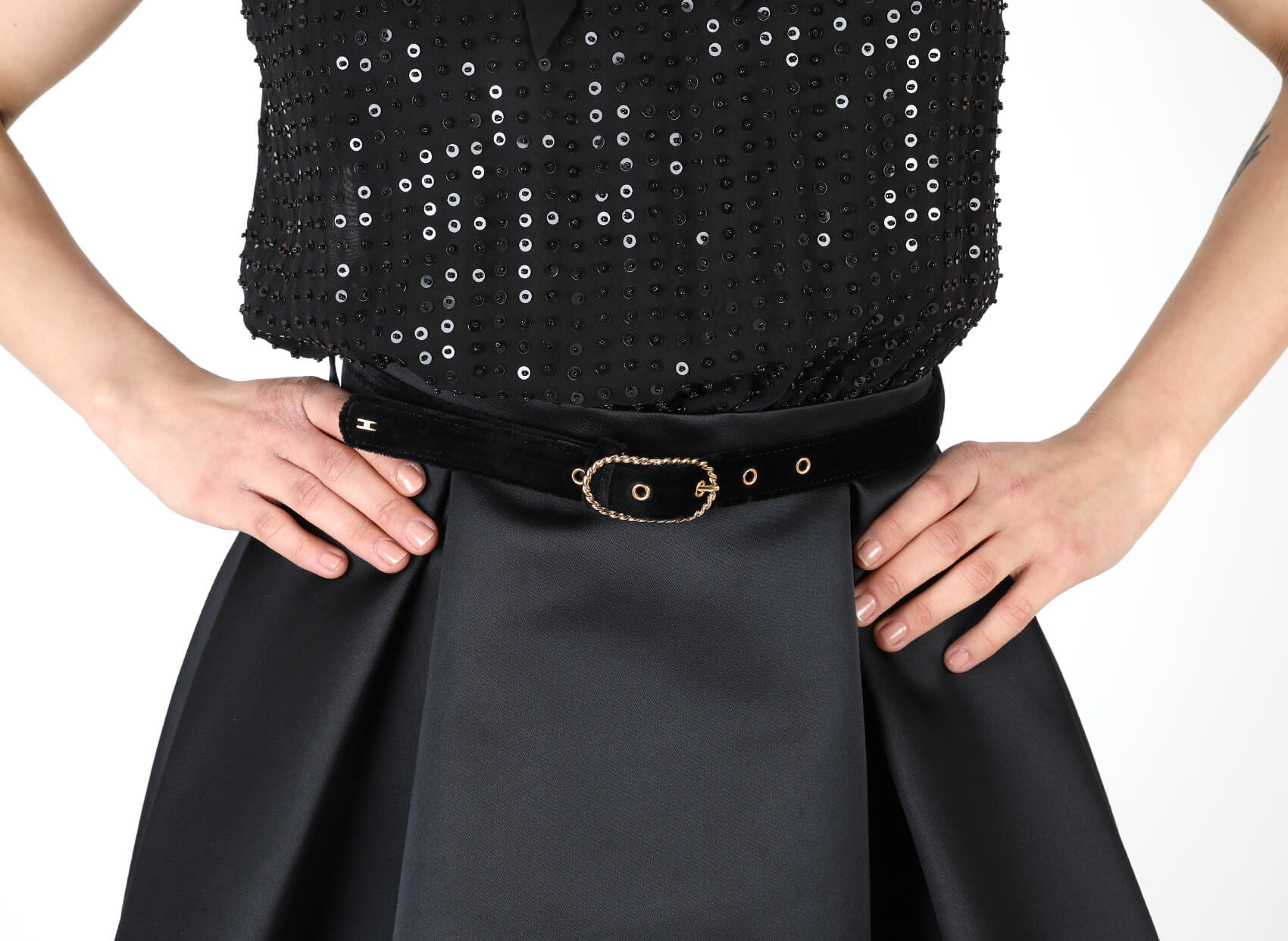 - Logo detaylı dore renk elips şeklinde burma halka formlu kemer