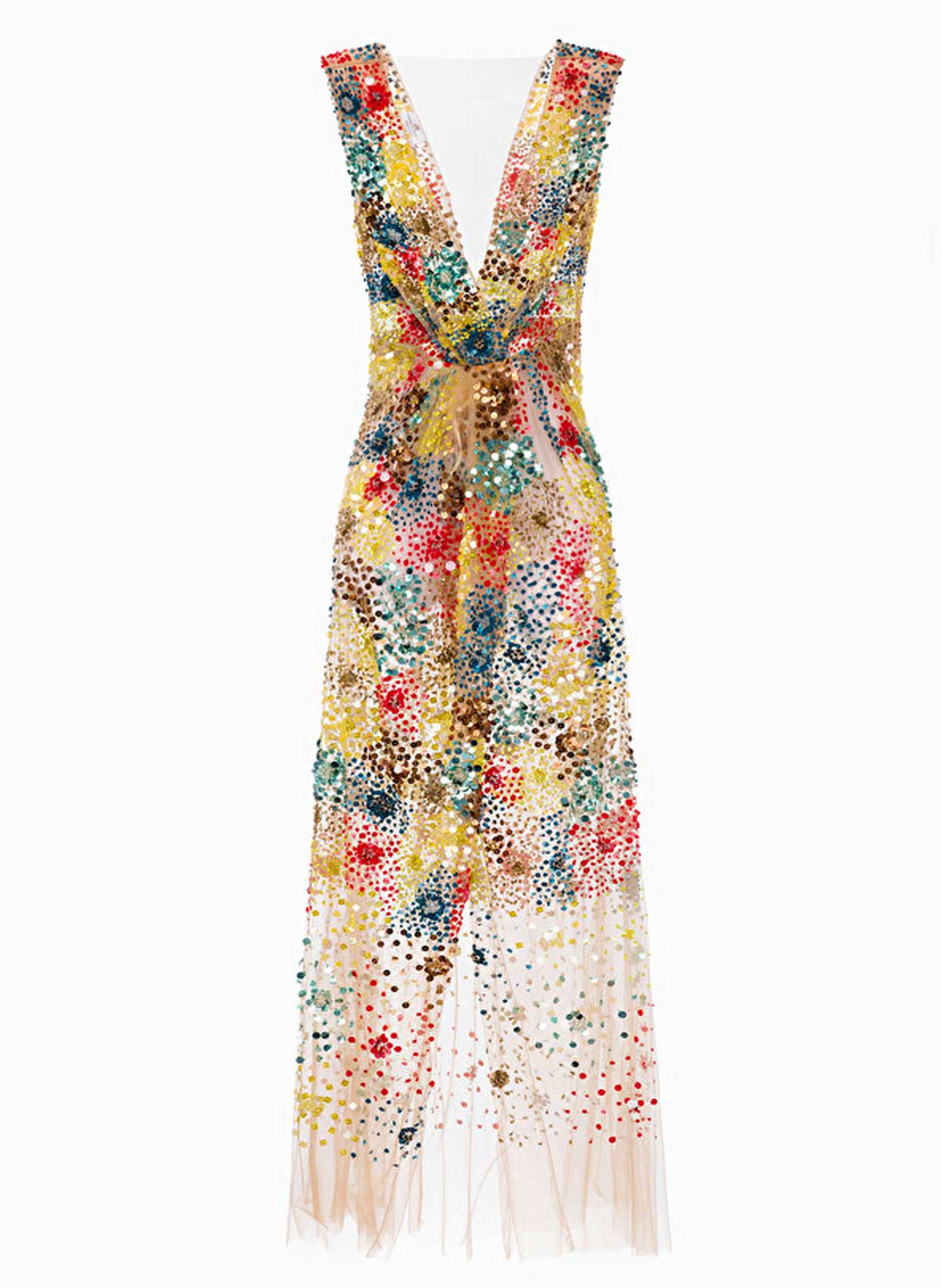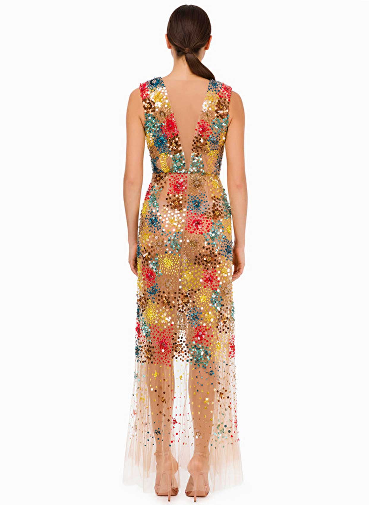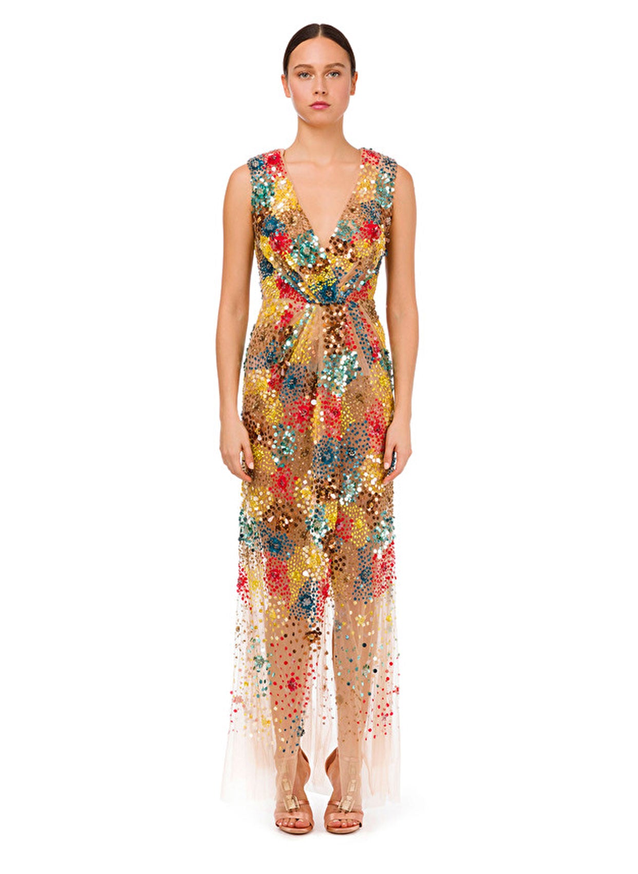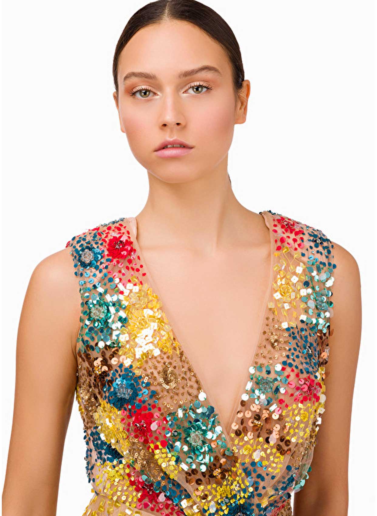 - Renkli payetlerin patlaması, bu uzun elbiseyi baştan ayağa, asetatların süper büyüleyici bir etkileşimi yaratan gölgeli bir efektle kaplar.