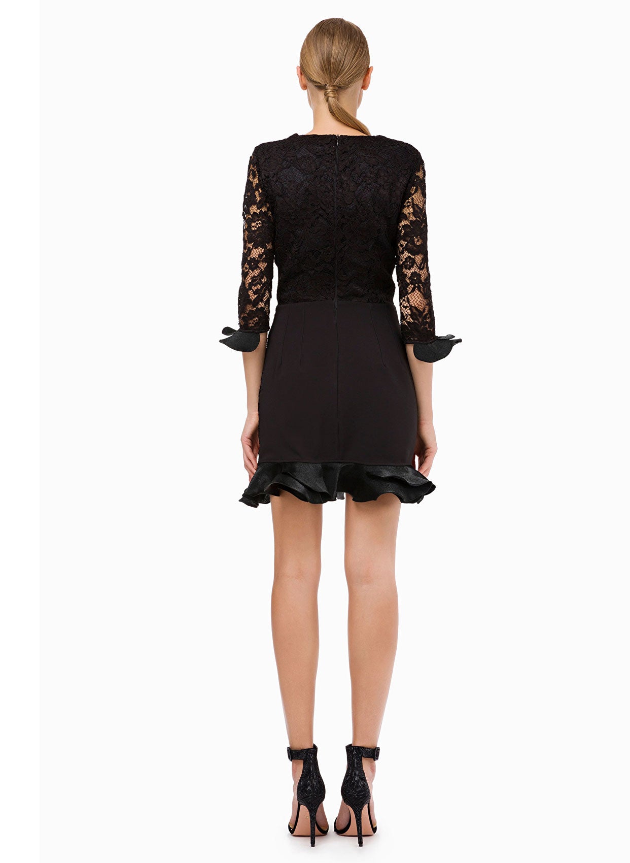 - Kısa dantel elbise zarif ve şık tasarımıyla romantik bir kadınsılık sunmaktadır.