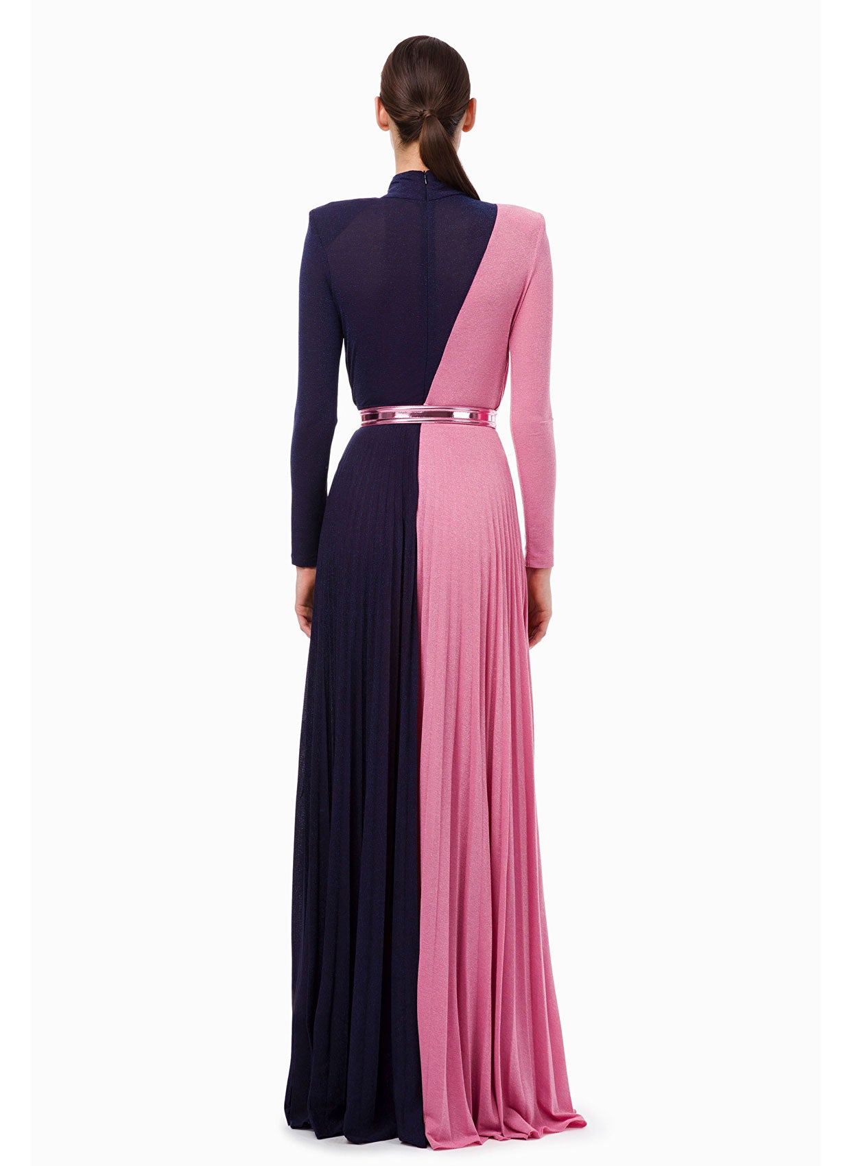 - İki renkli uzun elbise lame jarseden yapılmış, vücut hatlarını öne çıkaran marka logolu kemeri ile göğüsteki yarık ile muhteşem bir şıklık sunar.