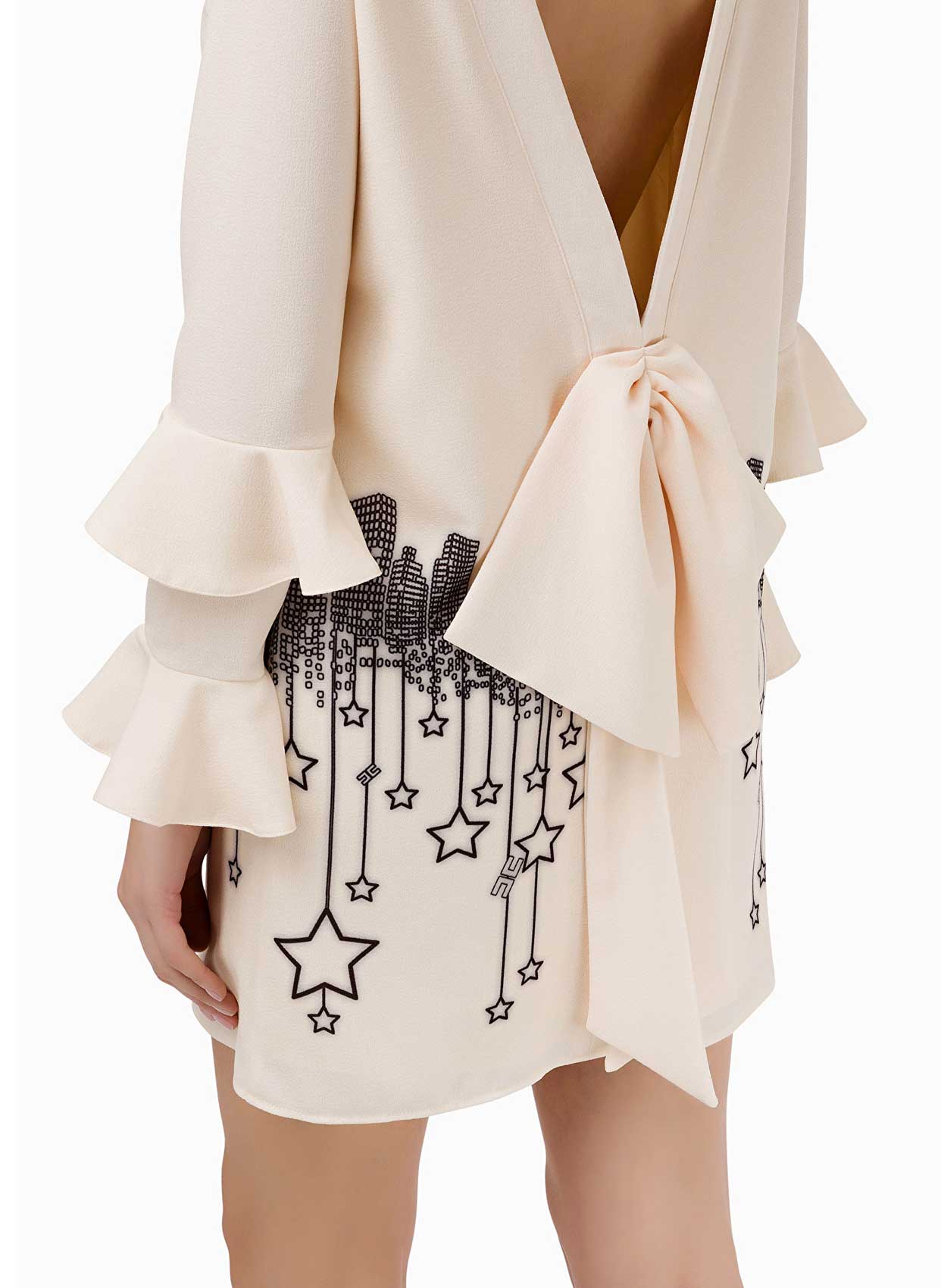 - Sırt dekolteli kısa krep kumaştan elbise.