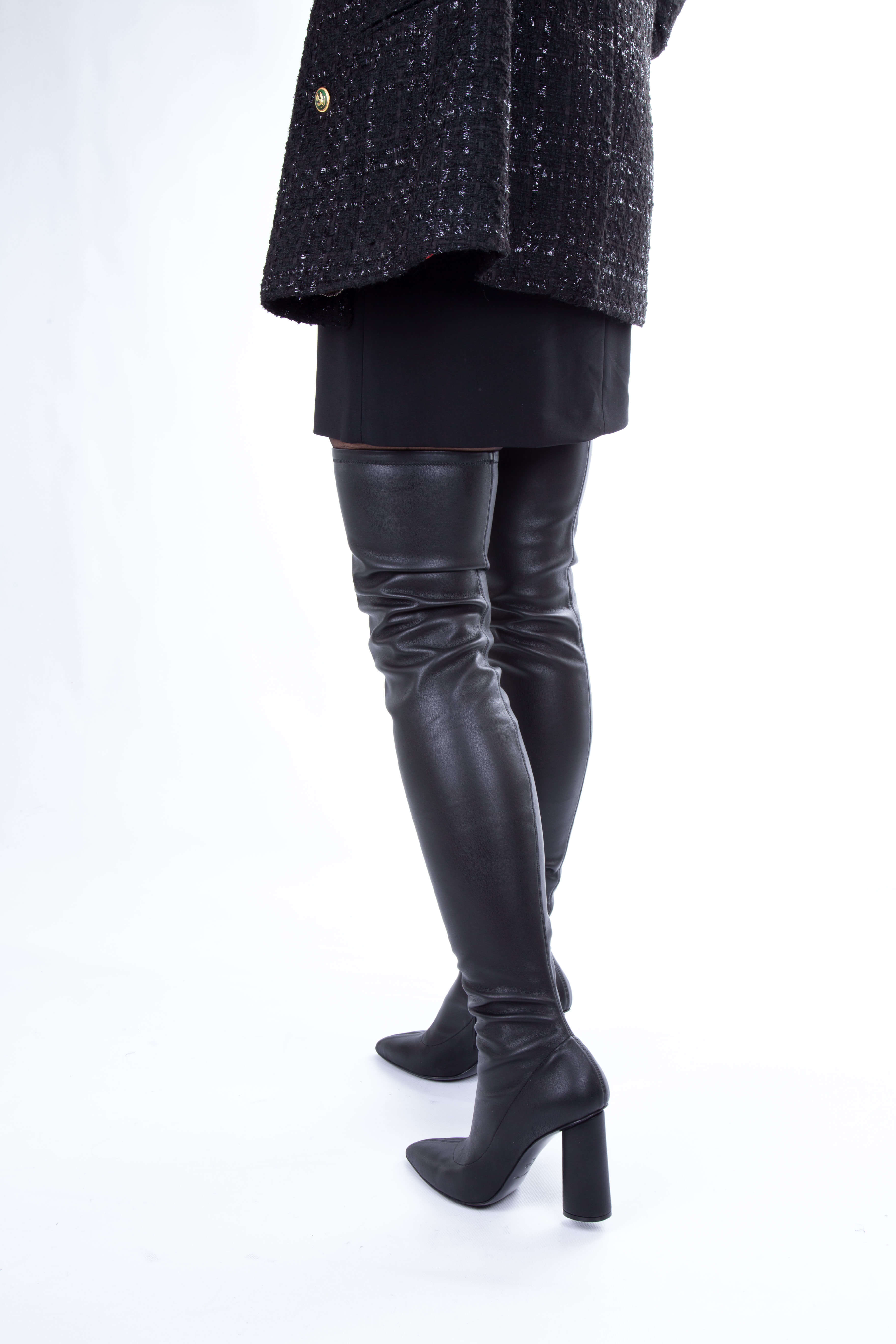 - Uzun elastik deri, topuklu diz üstü çizme.