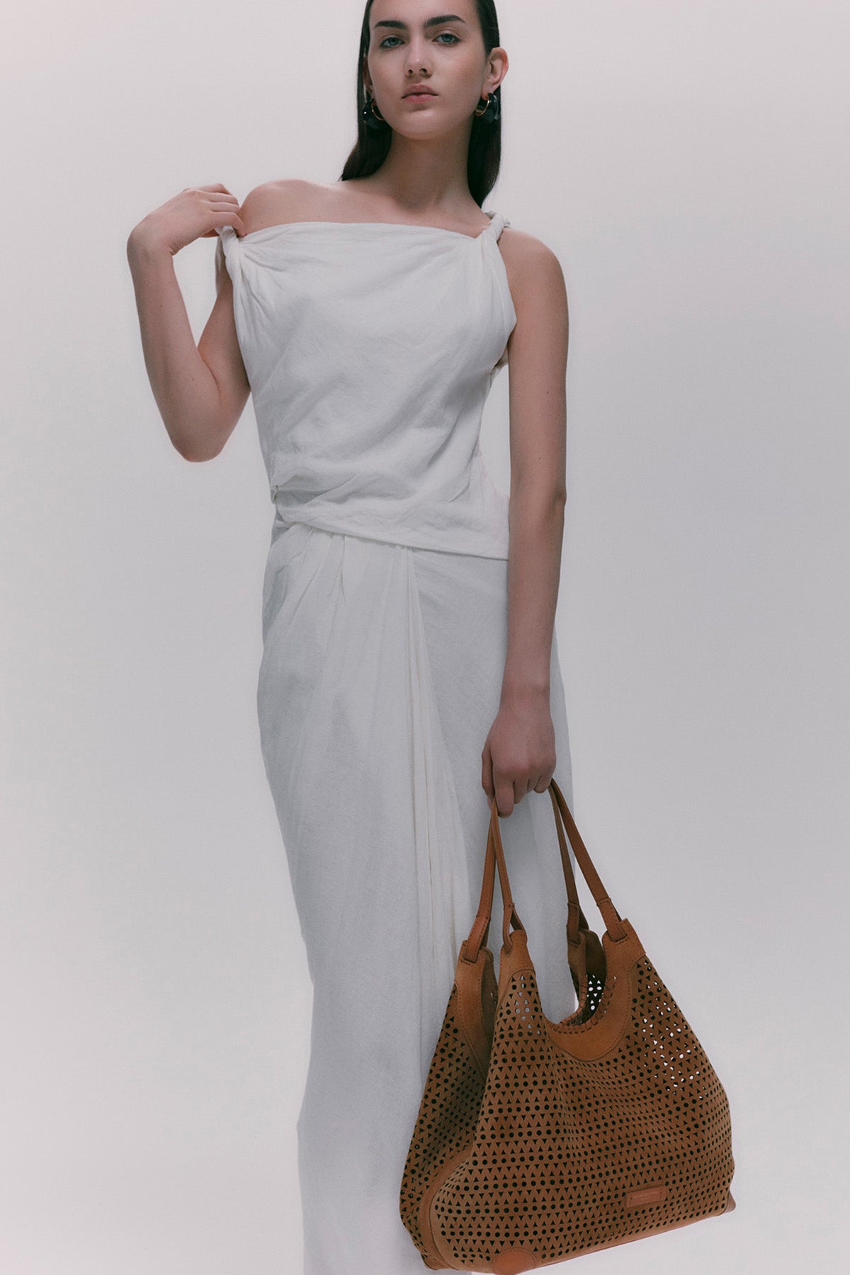 - Marka ikonu Dua, sade ama çağdaş bir tasarımla karakterize edilmiştir. Nubuk deriden üretilen bu çanta, benzersiz delikli bir dekorasyona sahiptir. Işık ve şeffaflıkların muhteşem oyunu onu çok trend hale getirir. Ürün, onu daha da pratik hale getirmek için fermuarlı bir çantayla birlikte gelir. Çantanın genişliğini ayarlamak için iki yan kanca mevcuttur.