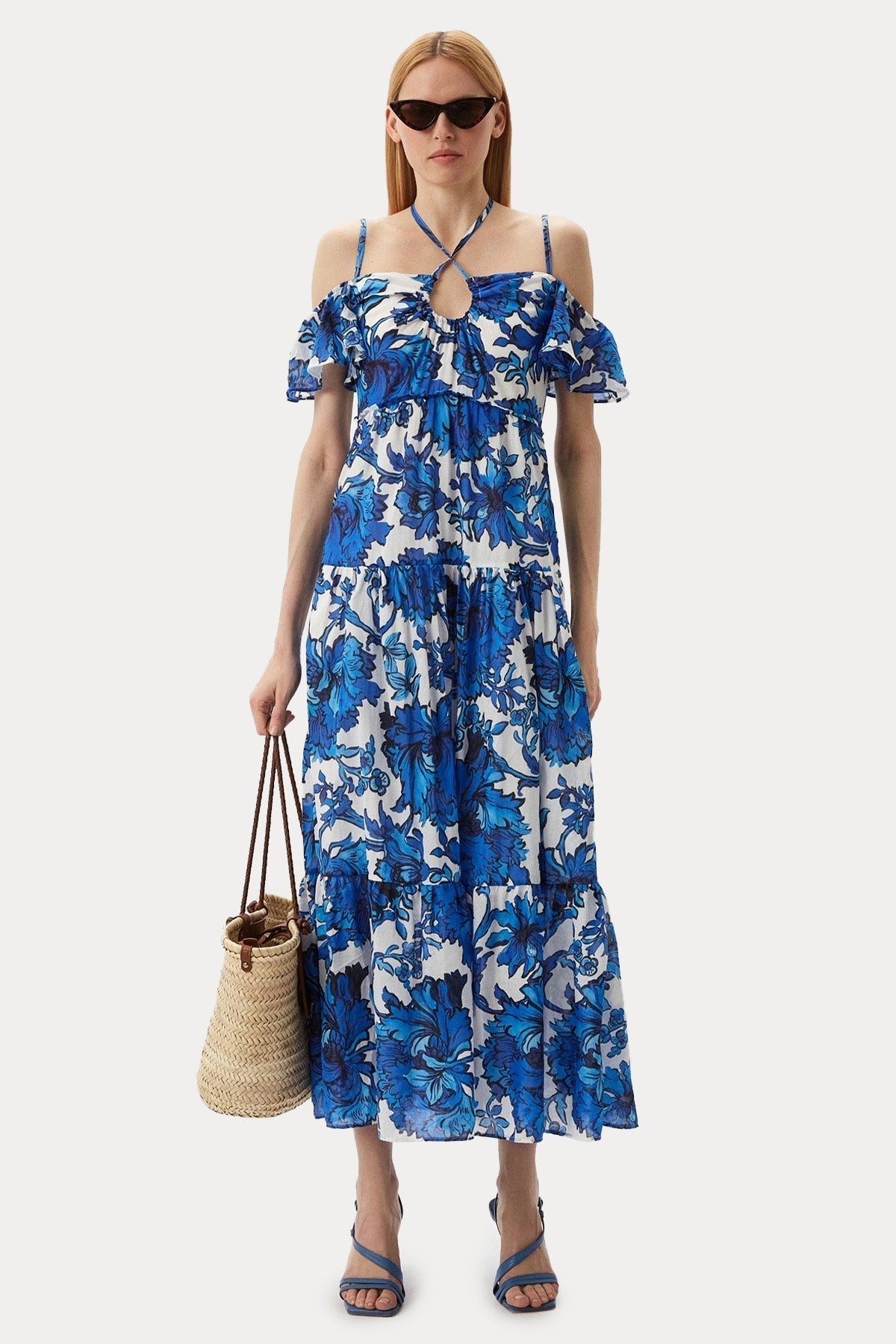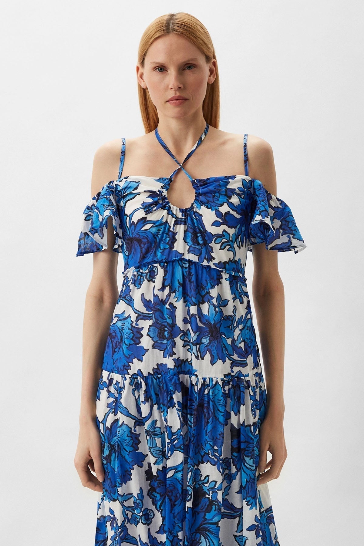 - Askılı boyun kısmında bağlamalı desenli elbise.