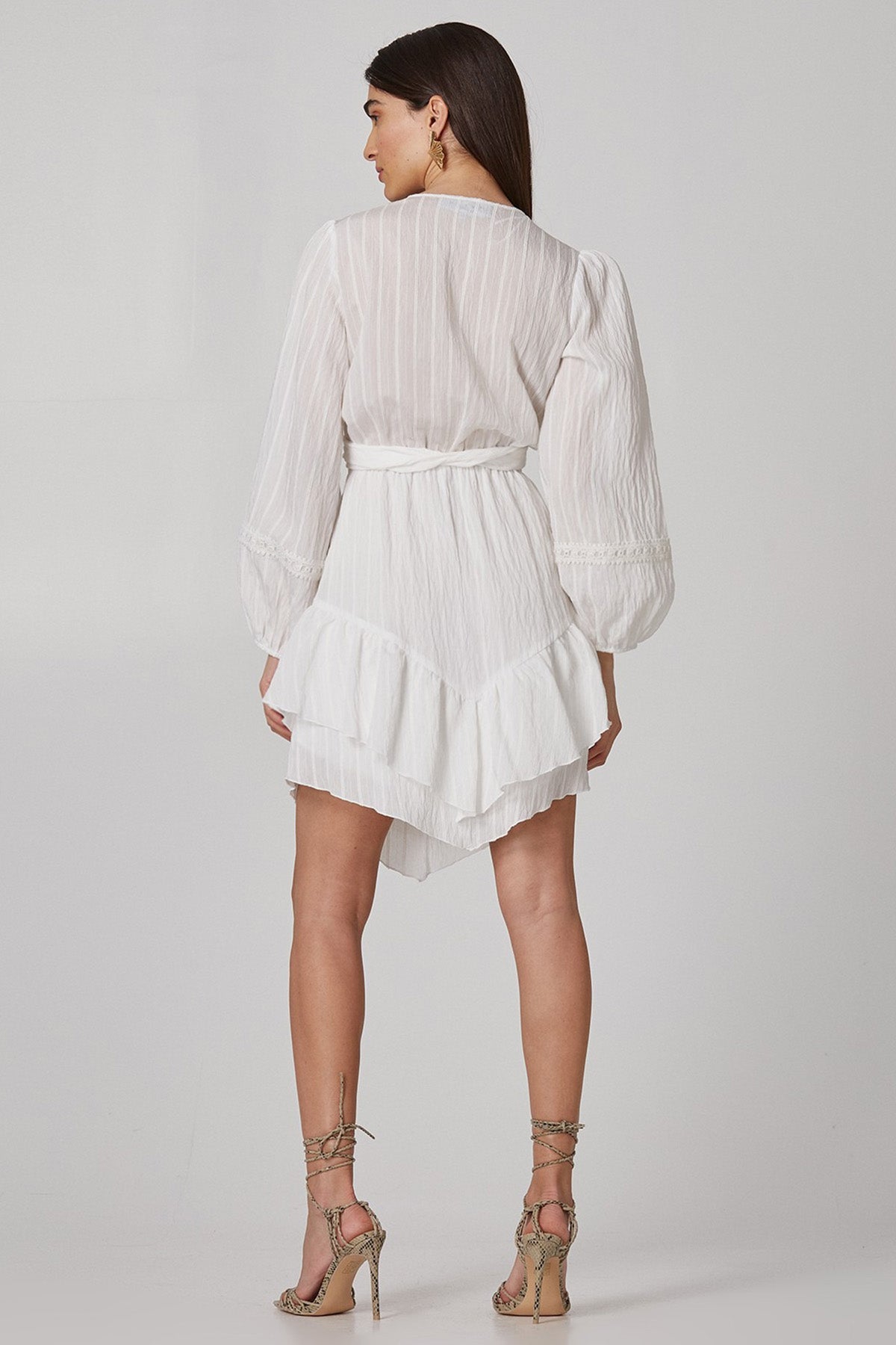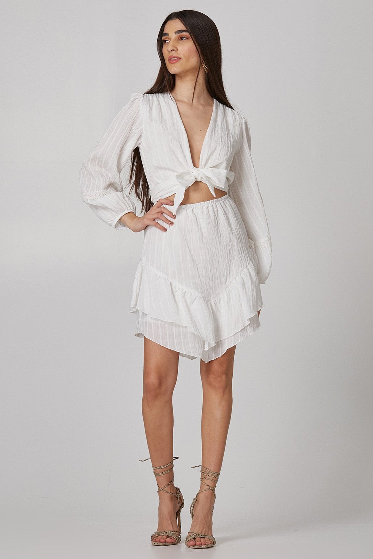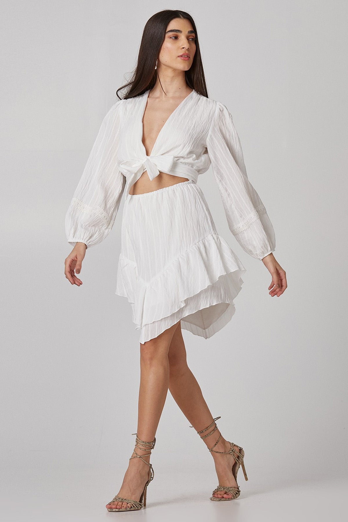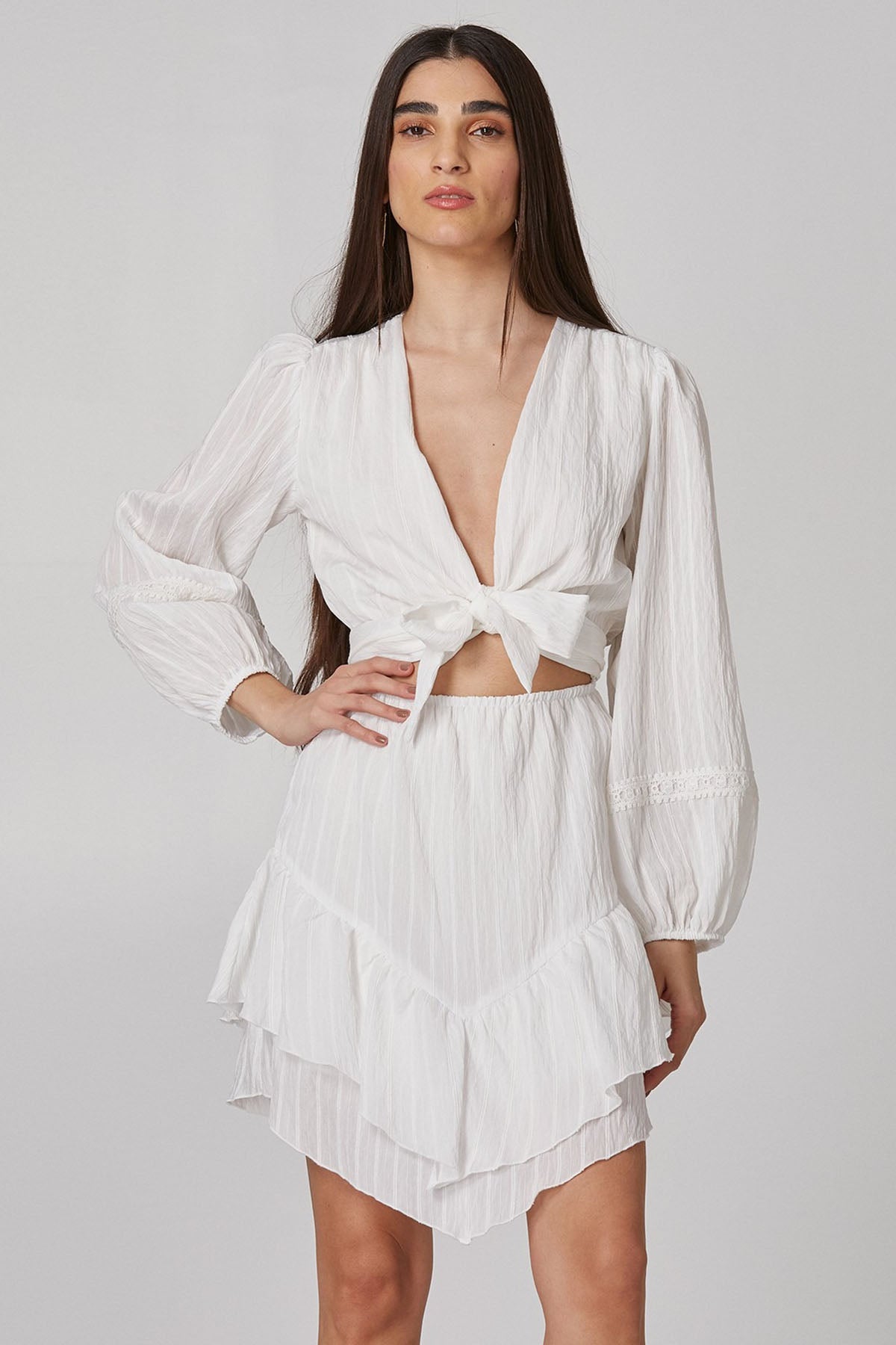 - Asimetrik kesim, katlı kumaş yapısına sahip etek kısmı.