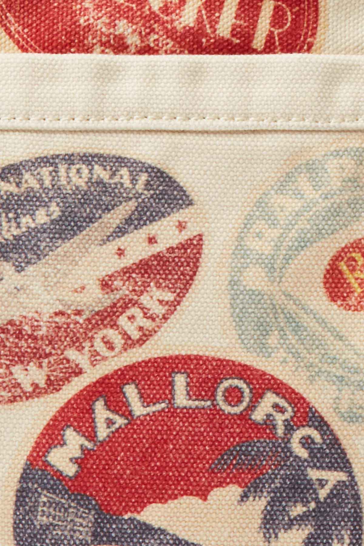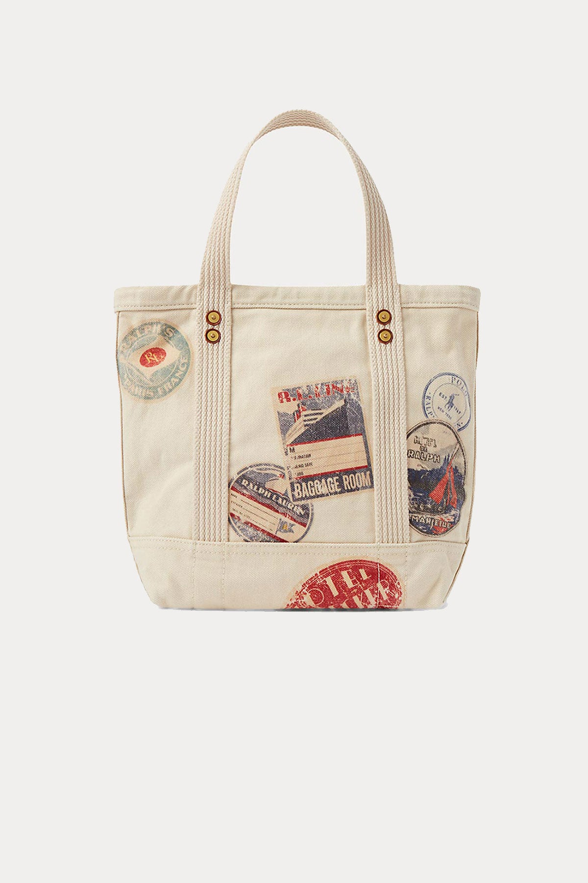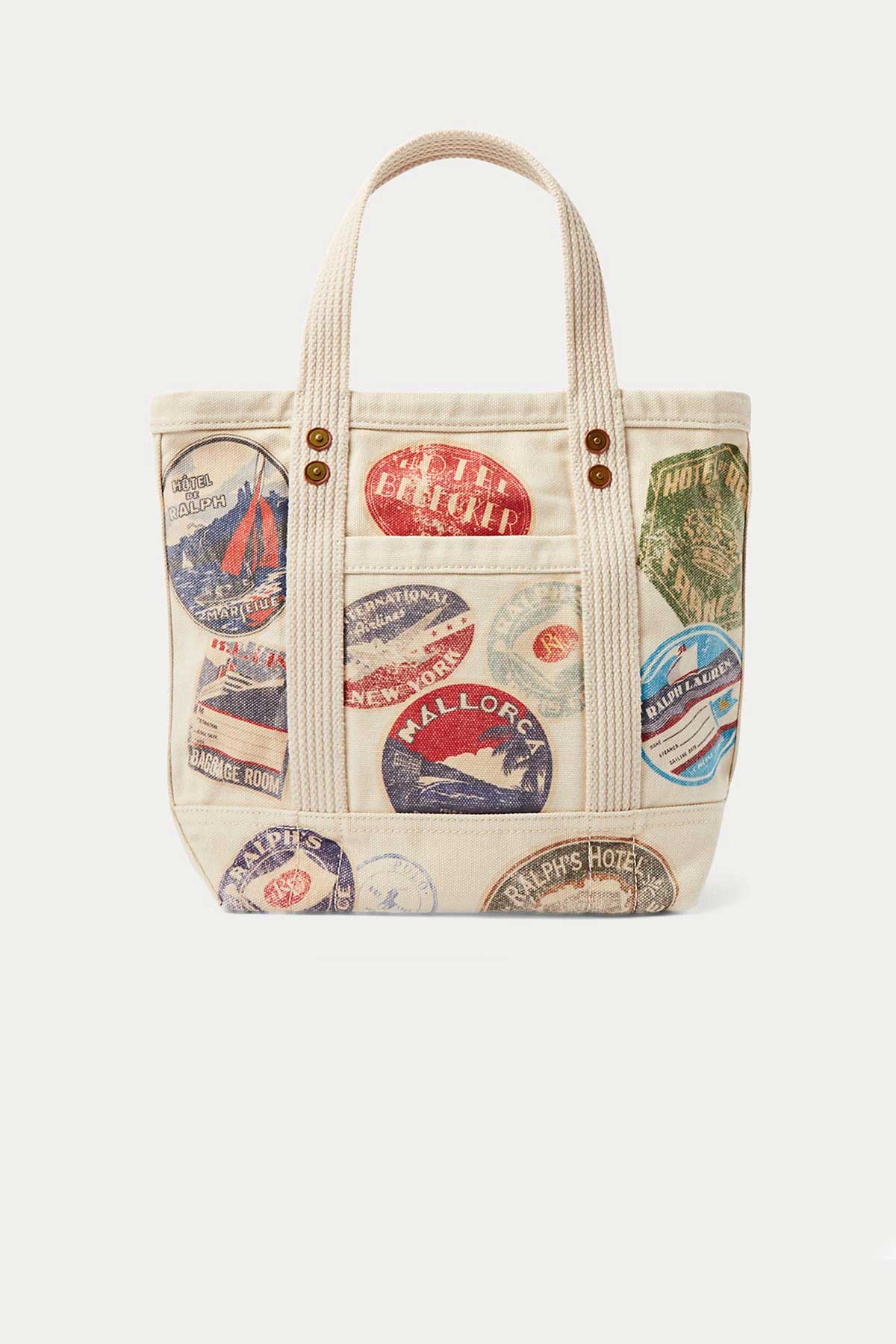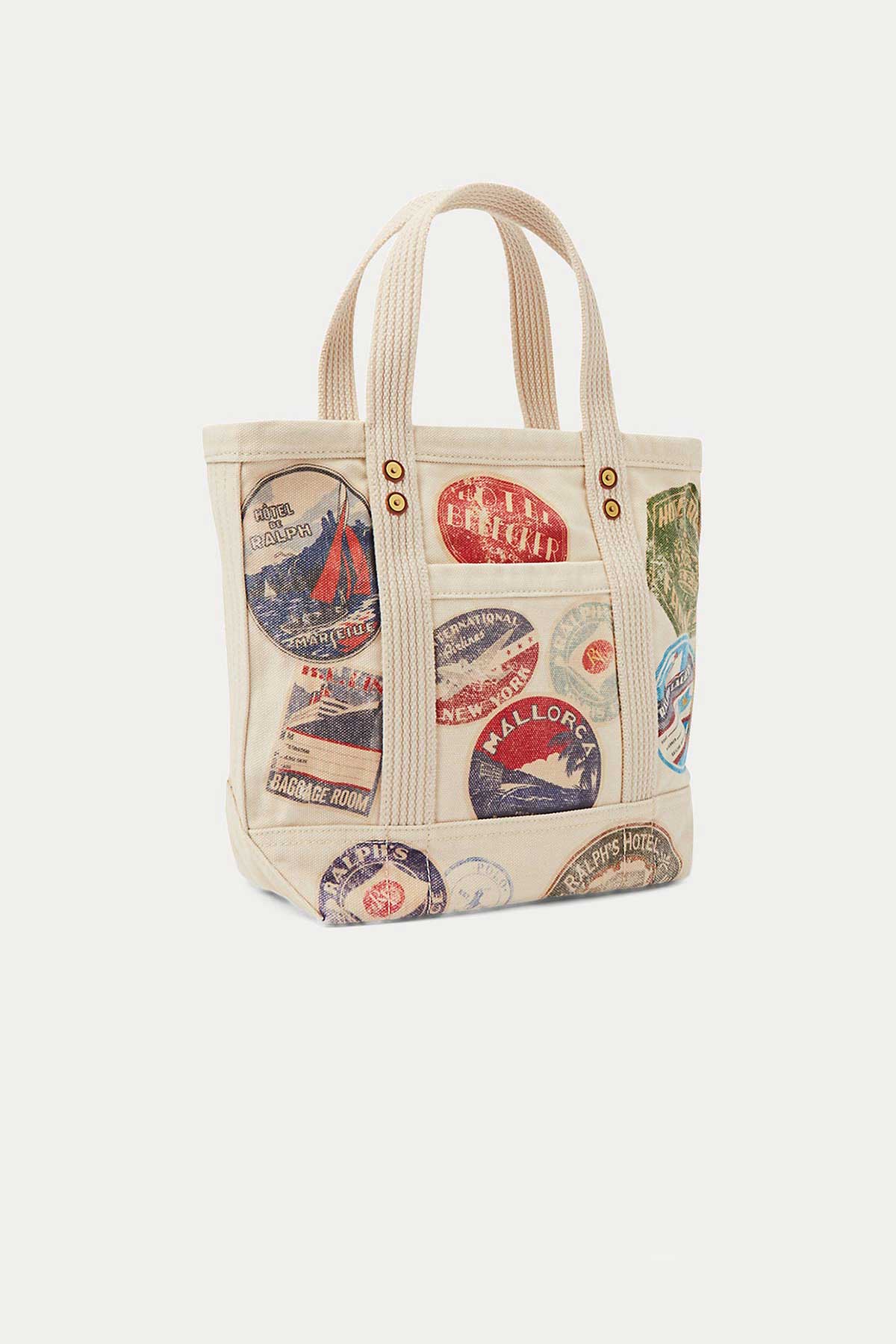 - Dayanıklı pamuklu kanvastan üretilen bu çanta, vintage seyahat çıkartmalarından ilham alan cesur bir baskıya sahiptir.