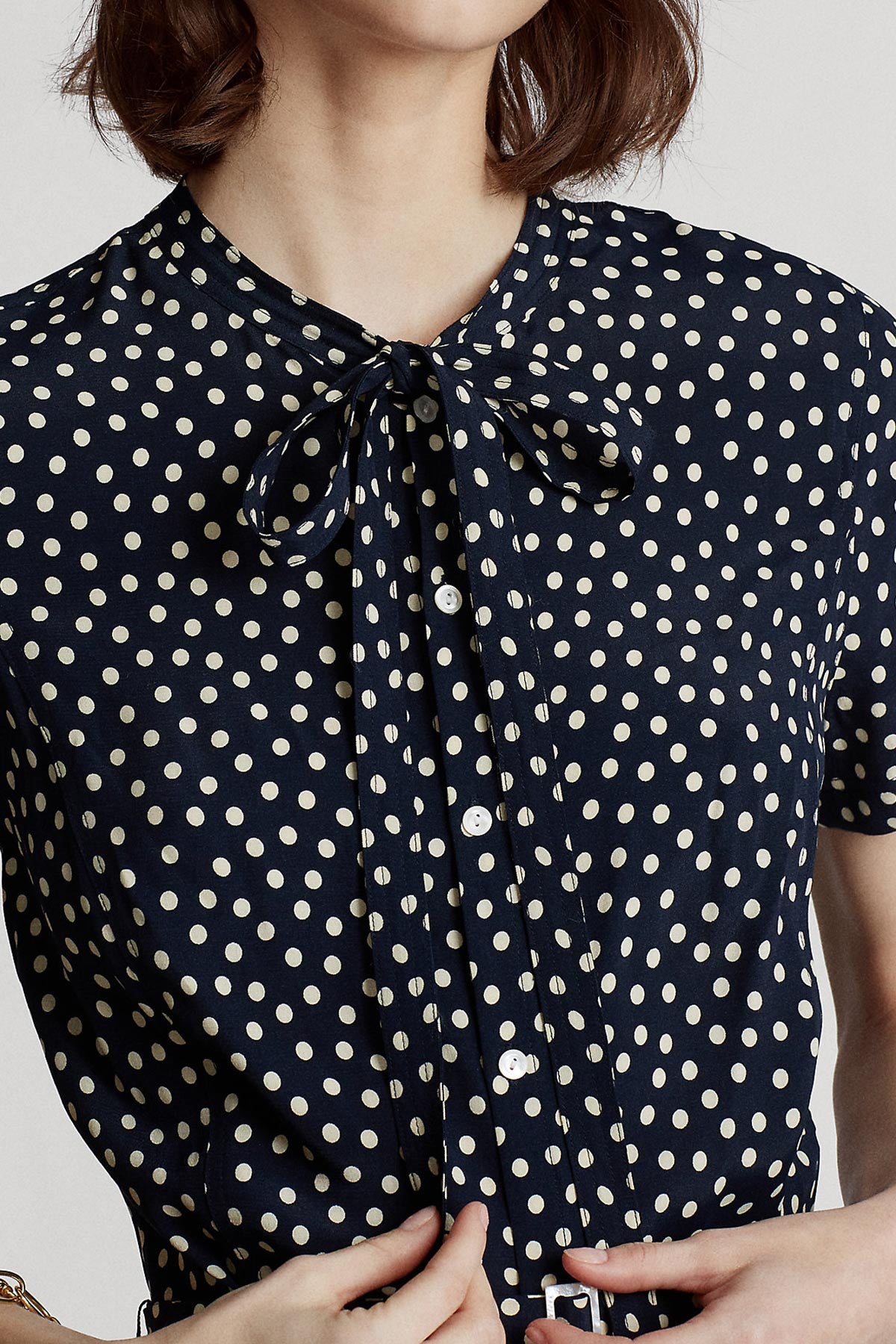 - Bedene oturan üst kısmı ve çan kesimli eteği ile yaka kısmındaki şal detayının verdiği feminen görünümü sedef detaylı kumaş kemer ile tamamlanan bu elbise, puantiye deseni ile göz kamaştırıcı bir görünüm sunuyor.