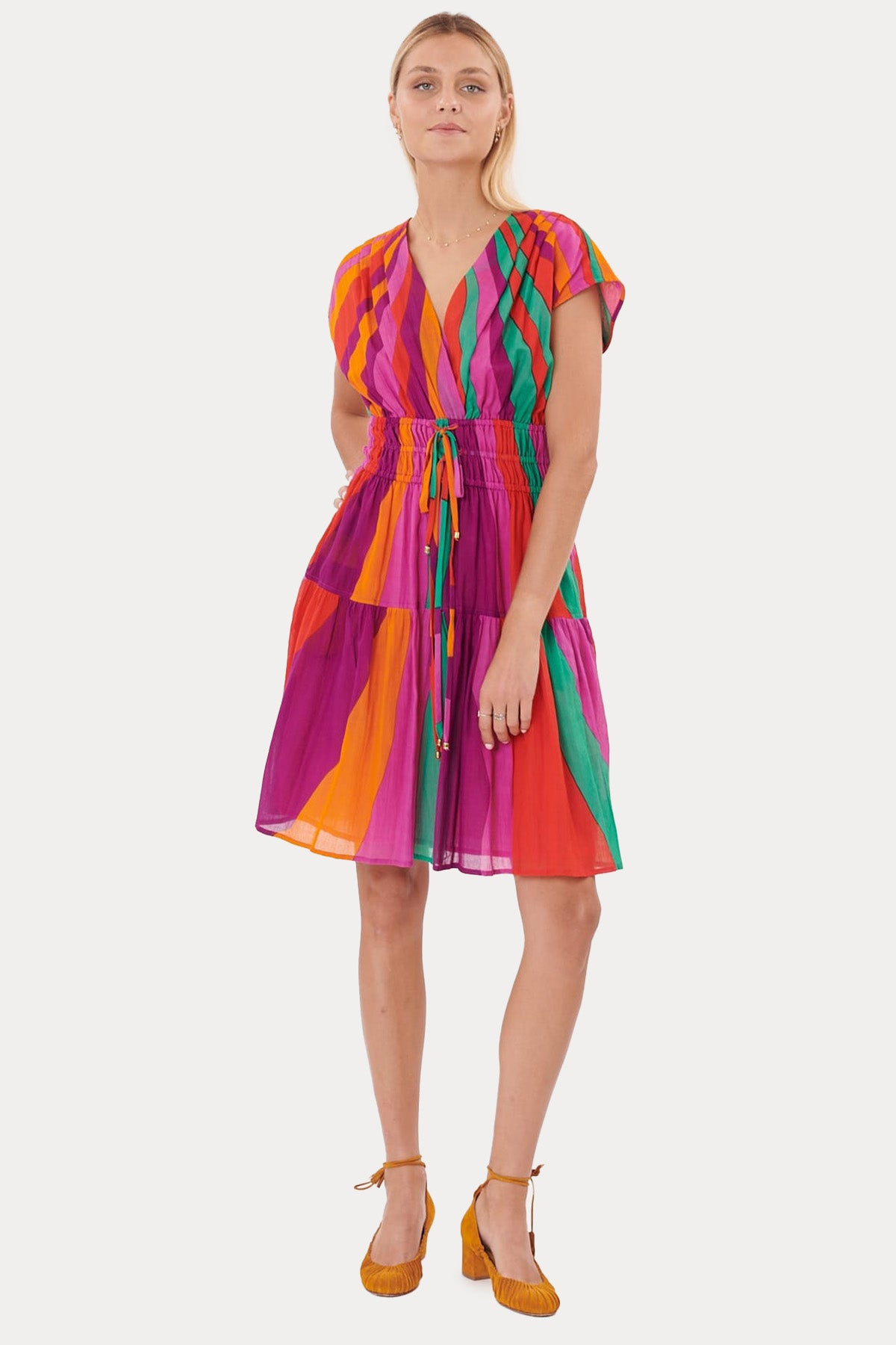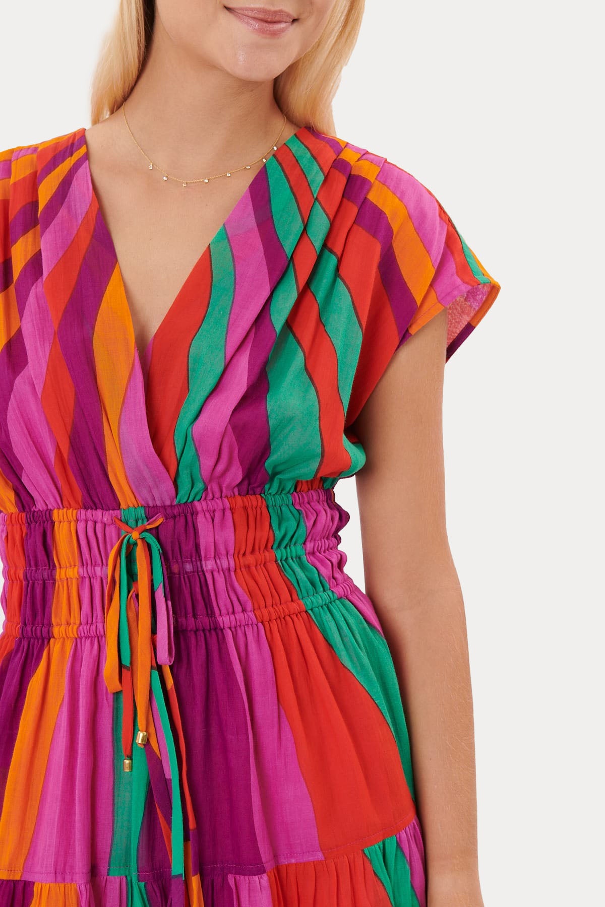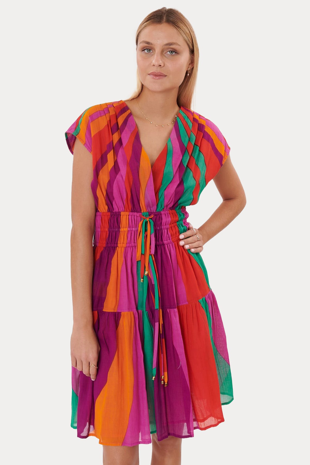 Rene Derhy V Yaka Belden Büzgülü Desenli Dizüstü Elbise