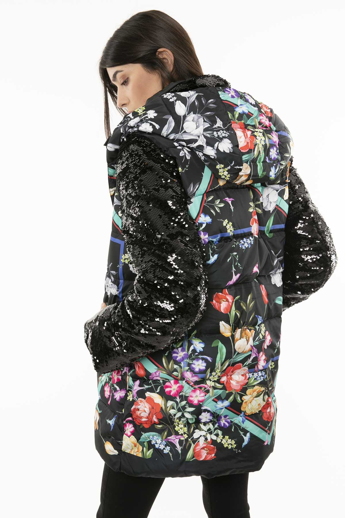 - Fermuar ve düğme ile sabitlenmiş parlak pul işlemeli demonte iç kısım.