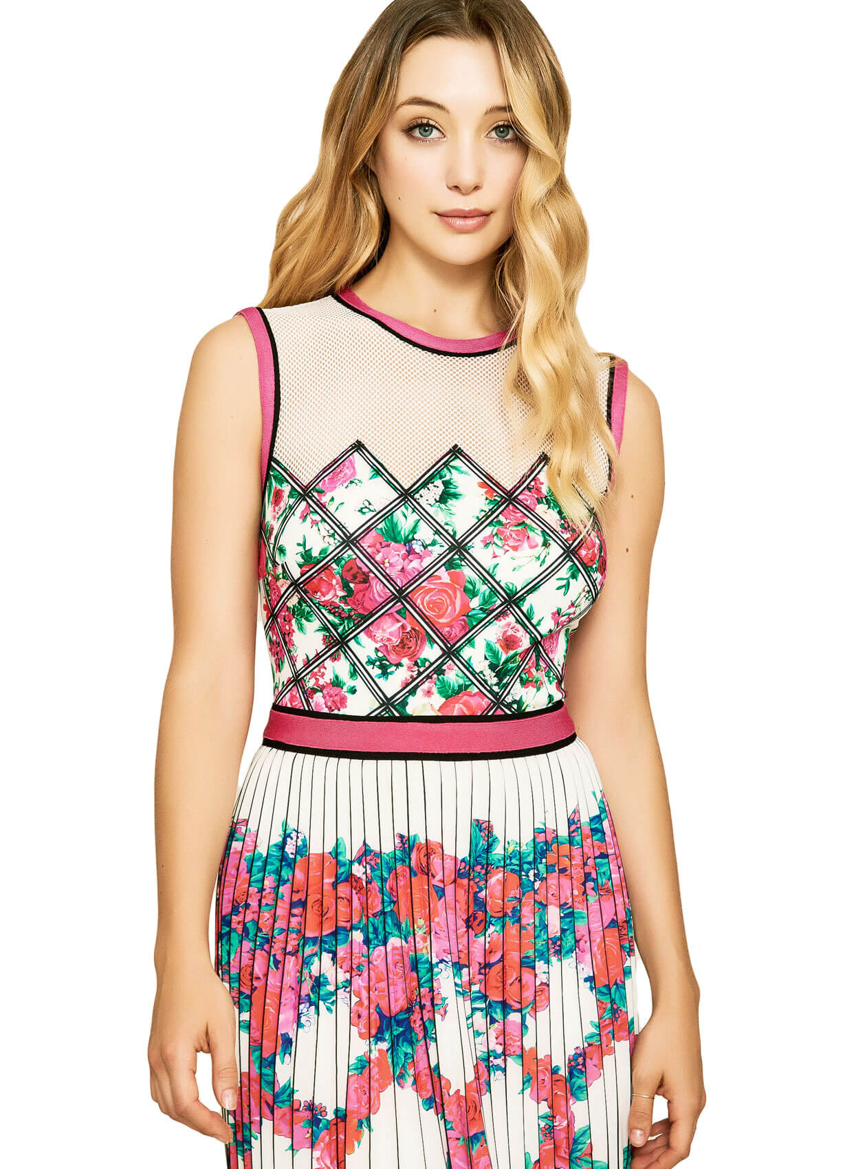 - Pileler ve zarif terzilik, cesur, sportif şeritler ve hem eğlenceli hem de sofistike bir elbise oluşturmak için dik boyunduruğu olan örme jakarlı bir korse ile dengelenmiştir.