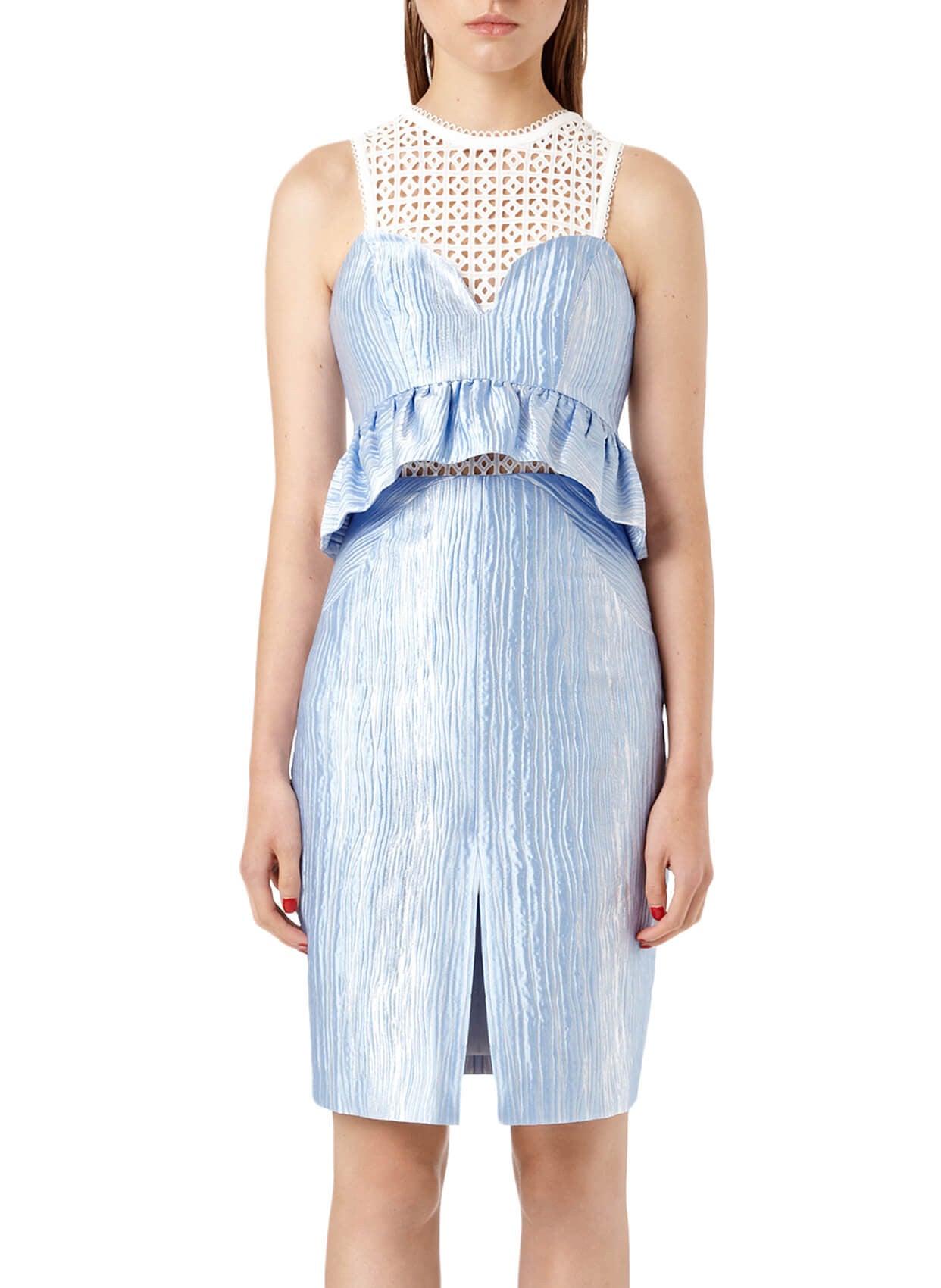 - Kendinden desenli, jakarlı kumaşıyla ön plana çıkan Three Floor elbise, küpürlü yakası, ön etek yırtmacı ve arka fermuarıyla tasarımını tamamlıyor