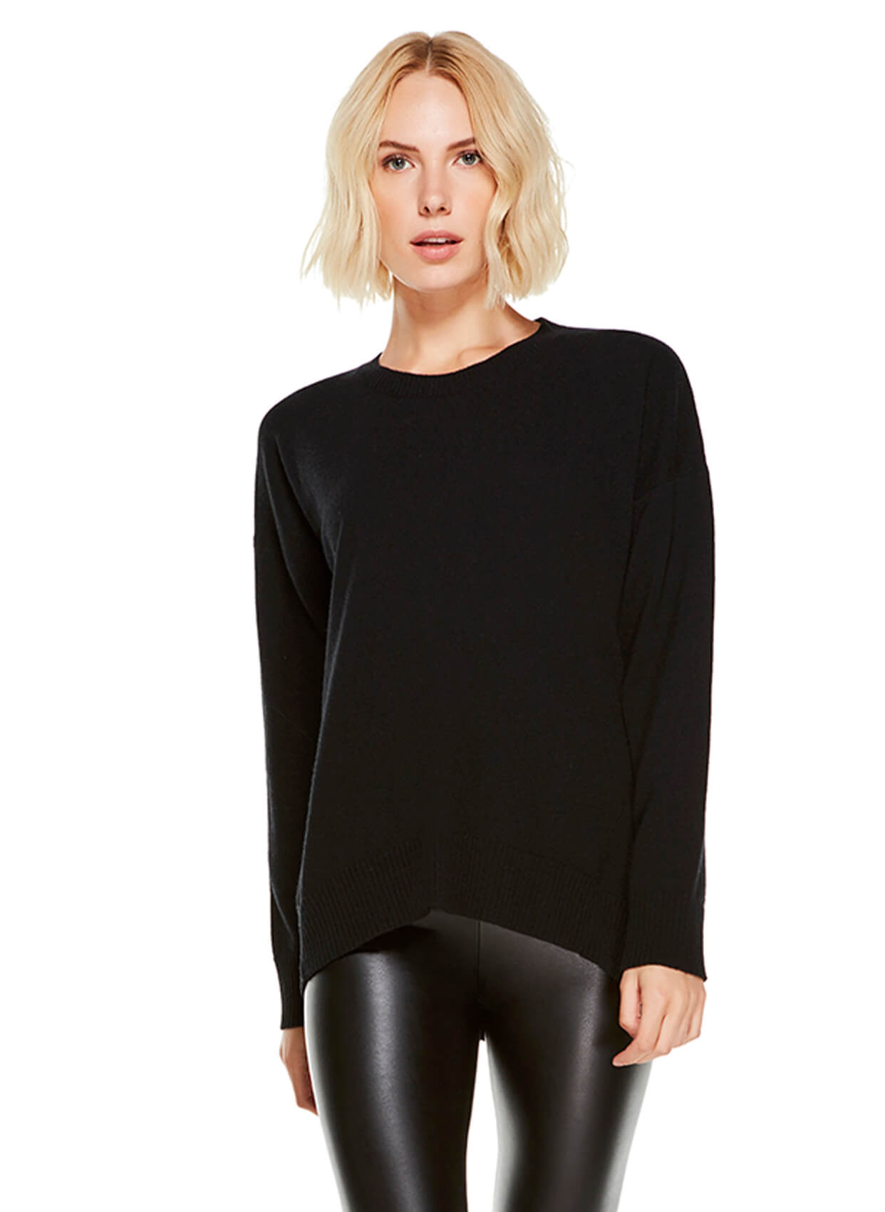 İtalyan cashmere ve merino yün ipliğinden üretilen, yanları dikiş detaylı, düşük omuzlu, asimetrik kesim, bisiklet yakalı triko.