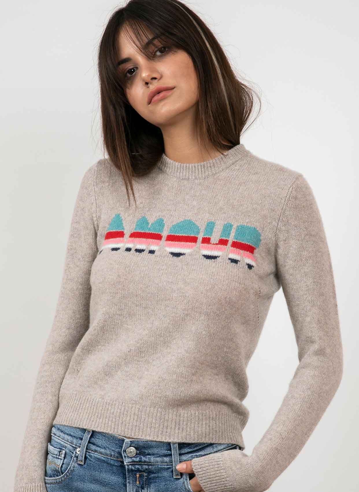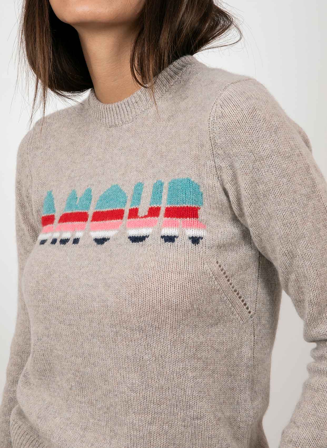 - Ön kısımda işlemeli AMOUR yazı detayı.