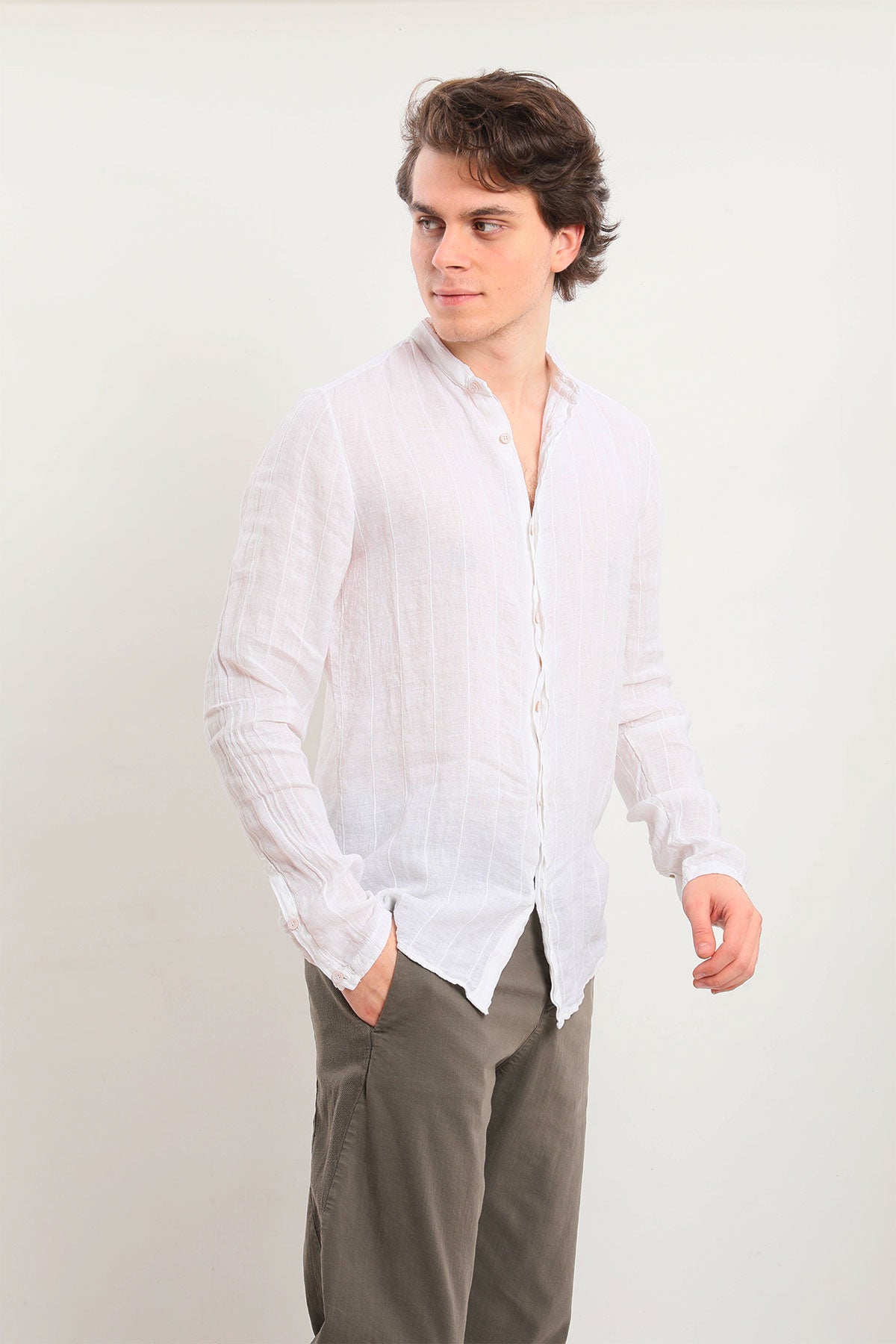 - Hakim yaka, uzun kollu keten gömlek.